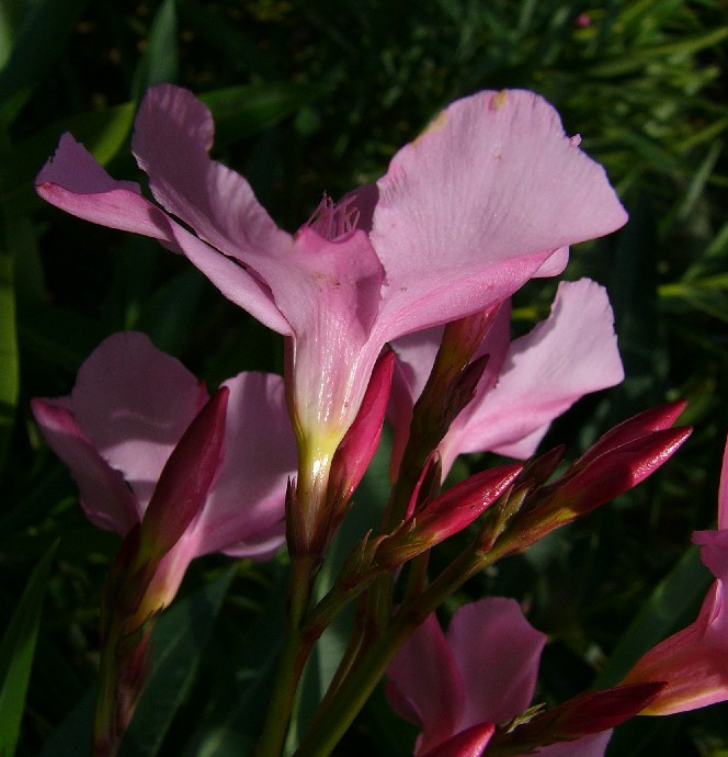 1 - 3 m hohe immergrüne Sträucher Blüten in Trugdolden Blüten je nach Sorte rosa, weiß, gelb oder hellviolett 3 - 6 cm im Durchmesser, 5 Kronblattzipfel, Staubbeutel in eine fadenförmige, behaarte Spitze auslaufend Blüten stieltellerförmig Balgfrüchte bis 18 cm lang, bohnenartig, rötlich braun