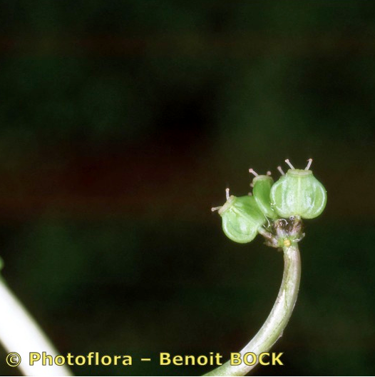 Früchte ca. 2 mm im Durchmesser, jung grüngelb, später meist mit violetten Fleckenseitlich stark zusammengedrückt, gerippt, am Grund +/- herzförmig, Griffel bleibend