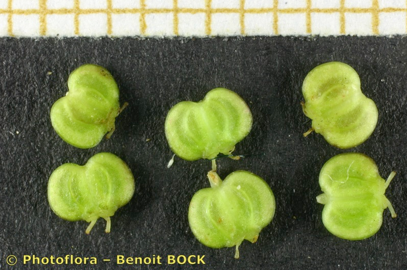 Früchte ca. 2 mm im Durchmesser, seitlich stark zusammengedrückt, gerippt, am Grund +/- herzförmig, Griffel bleibend