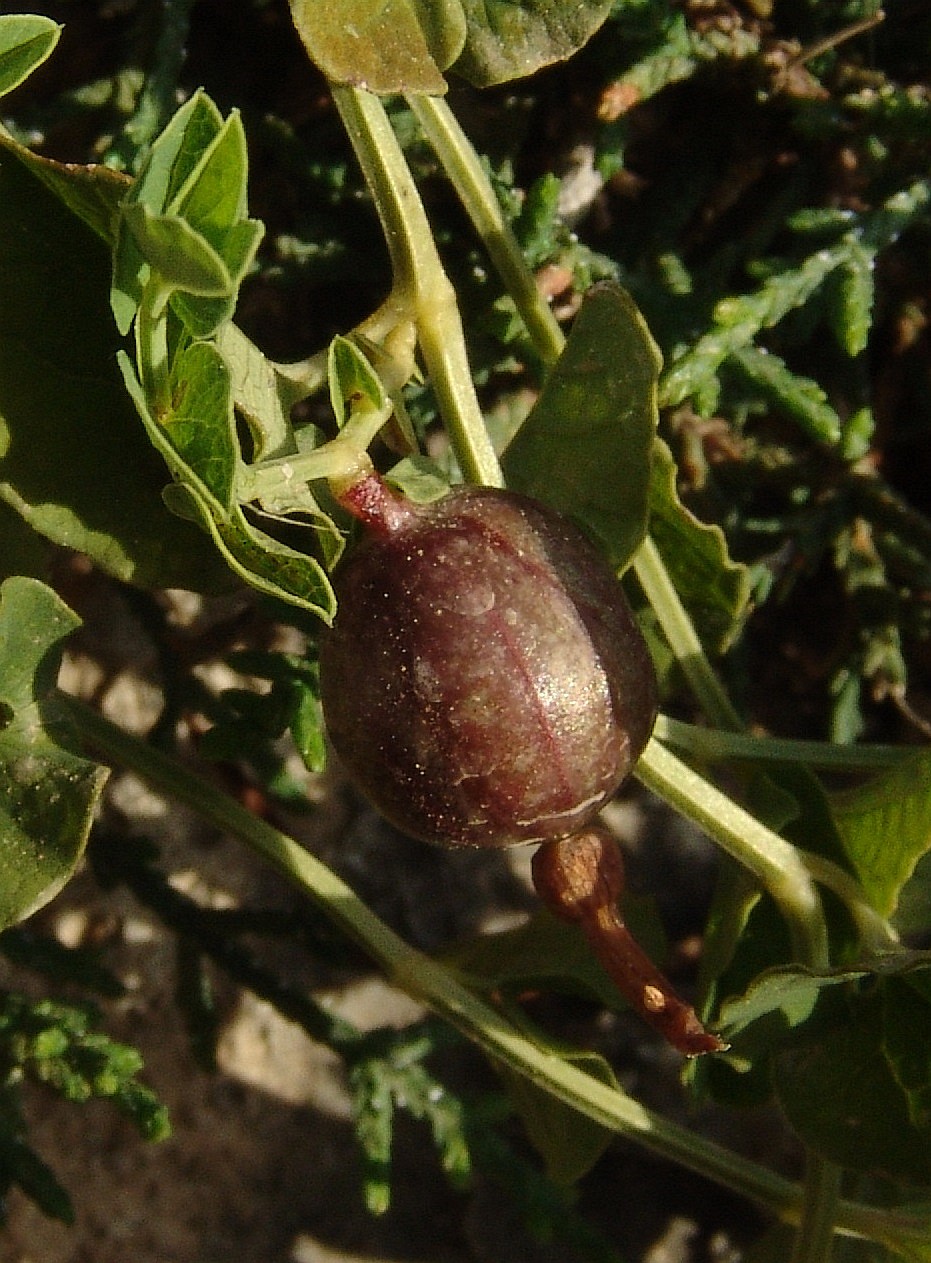 Frucht ei- oder birnenförmig, 20 - 30 mm im Durchmesser Blätter 2 - 7 cm lang, nierenförmig, mit ca. 2 cm langem Stiel