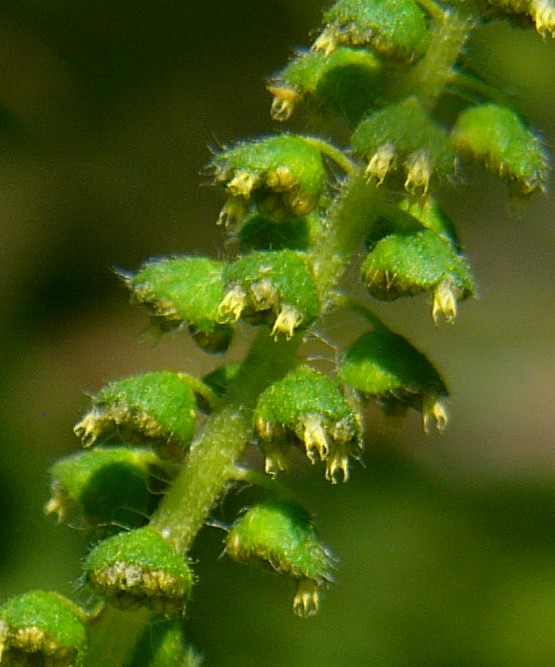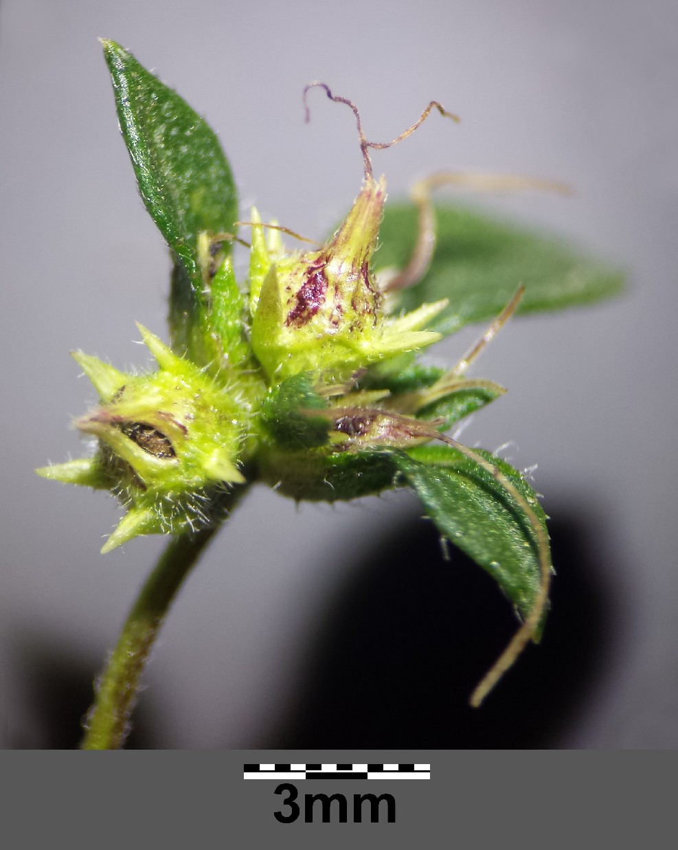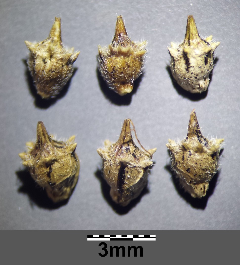 Fruchthülle 3 - 4 mm lang, meist mit 4 - 7 kegelförmigen Zähnen hell- oder dunkelbraun, oft auch mit schwarzvioletten Punkten oder Strichen, +/- behaart, Schnabel der Frucht konisch, Griffel abfallend