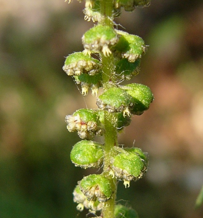 kahl oder behaart Weibliche Köpfchen einzeln oder zu 2 - 3 in den Achseln der obersten Blätter, Weibliche Blüten bestehen aus einem unterständigen, zweifächrigen Fruchtknoten und einem Griffel mit 2 langen Narben, ohne Pappus, Kronblätter stark reduziert und mit bloßem Auge nicht erkennbar, Körbchenhülle 4 - 7- zähnig, den Fruchtknoten halb umschließend, bleibend, später verholzend