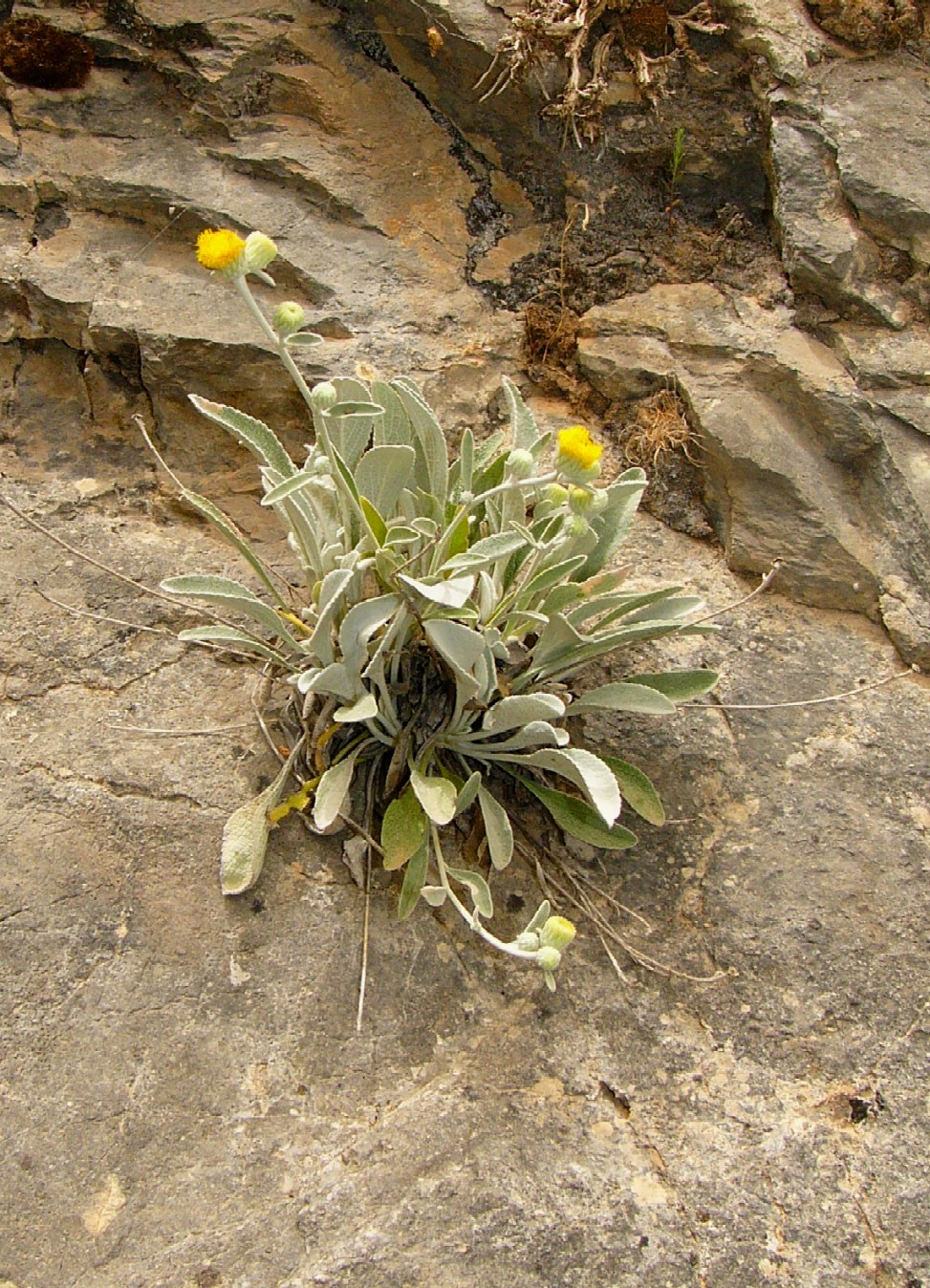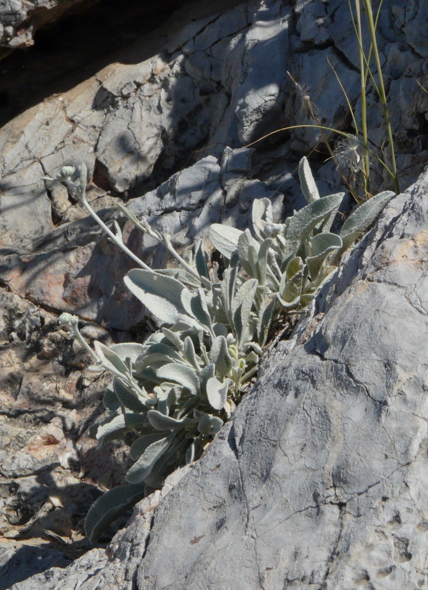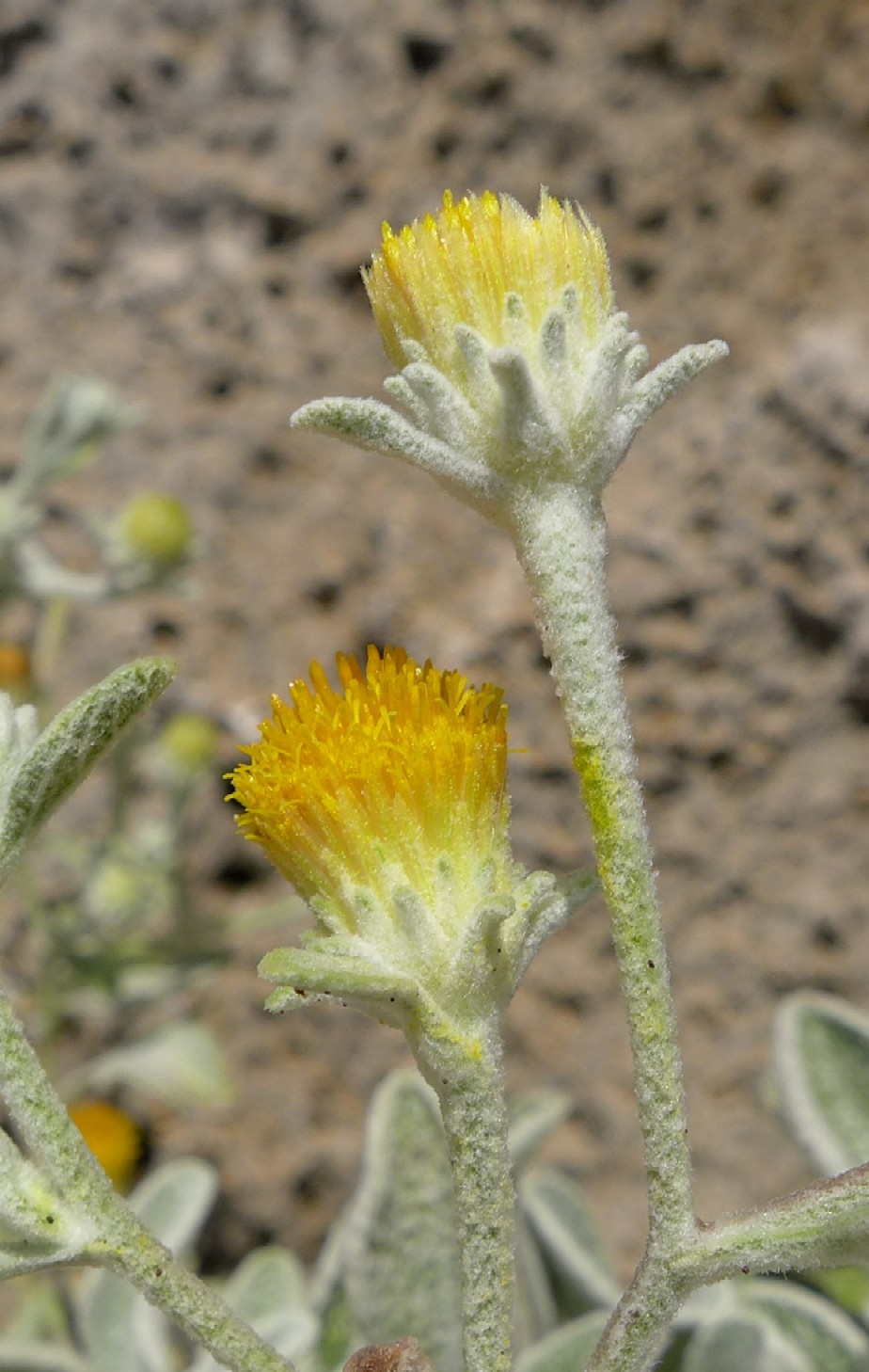 Inula - Pflanze schneeweiß filzig behaart, Zungenblüten nicht sichtbar, kürzer als die Hülle, Blätter gezähnt