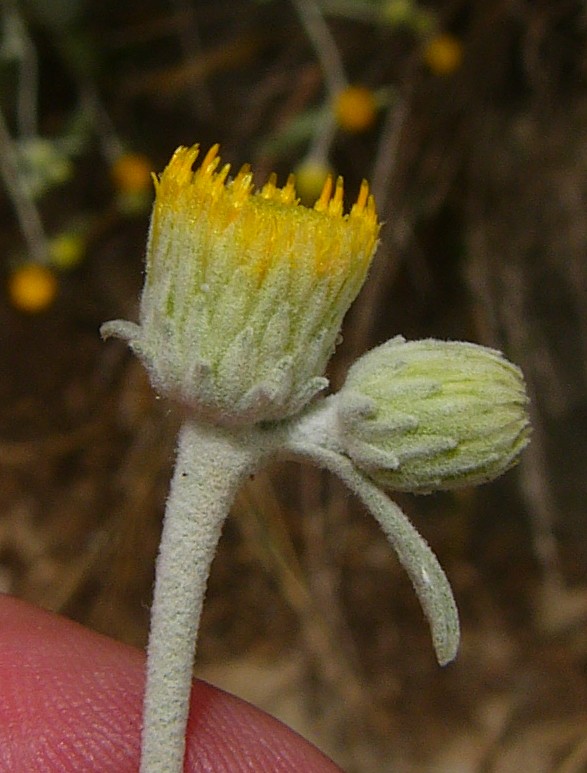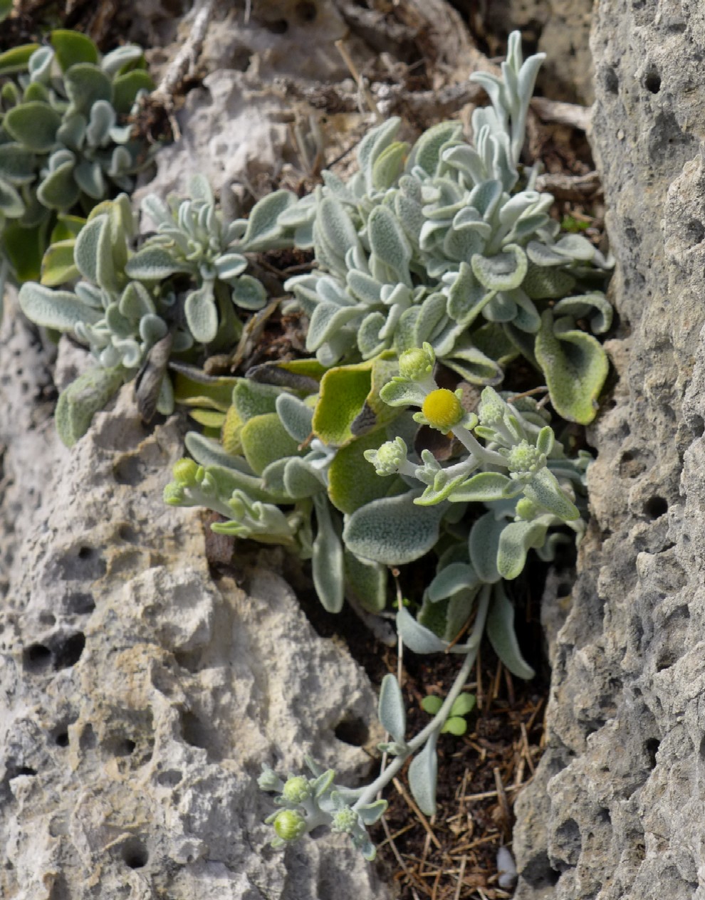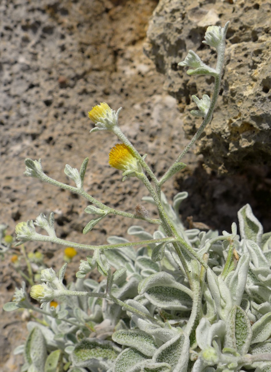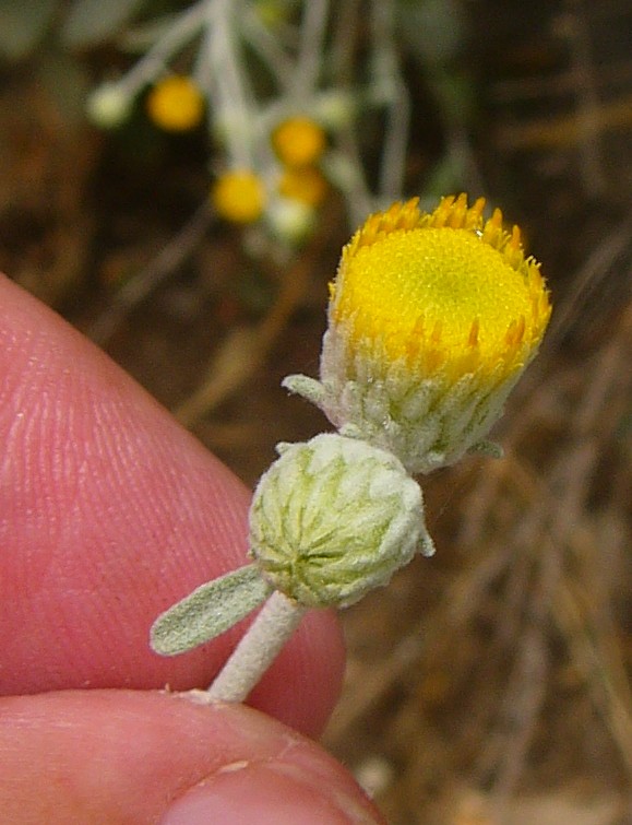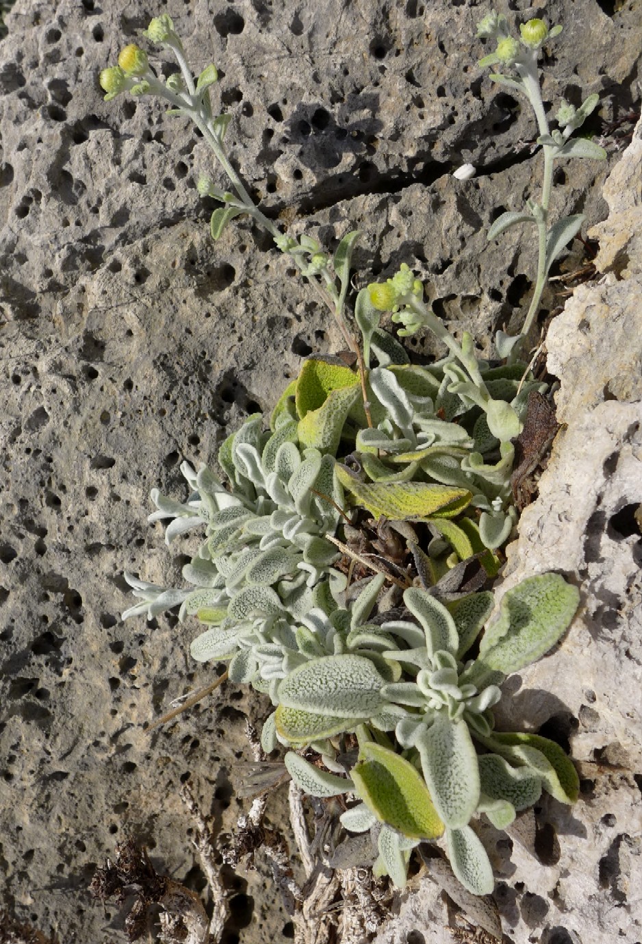 Inula - Pflanze schneeweiß filzig behaart, Zungenblüten nicht sichtbar, kürzer als die Hülle, Blätter gezähnt