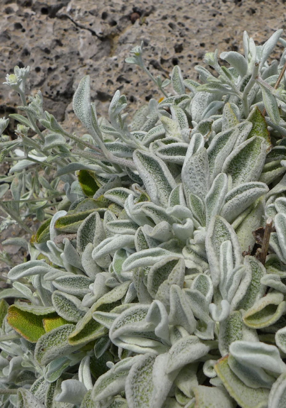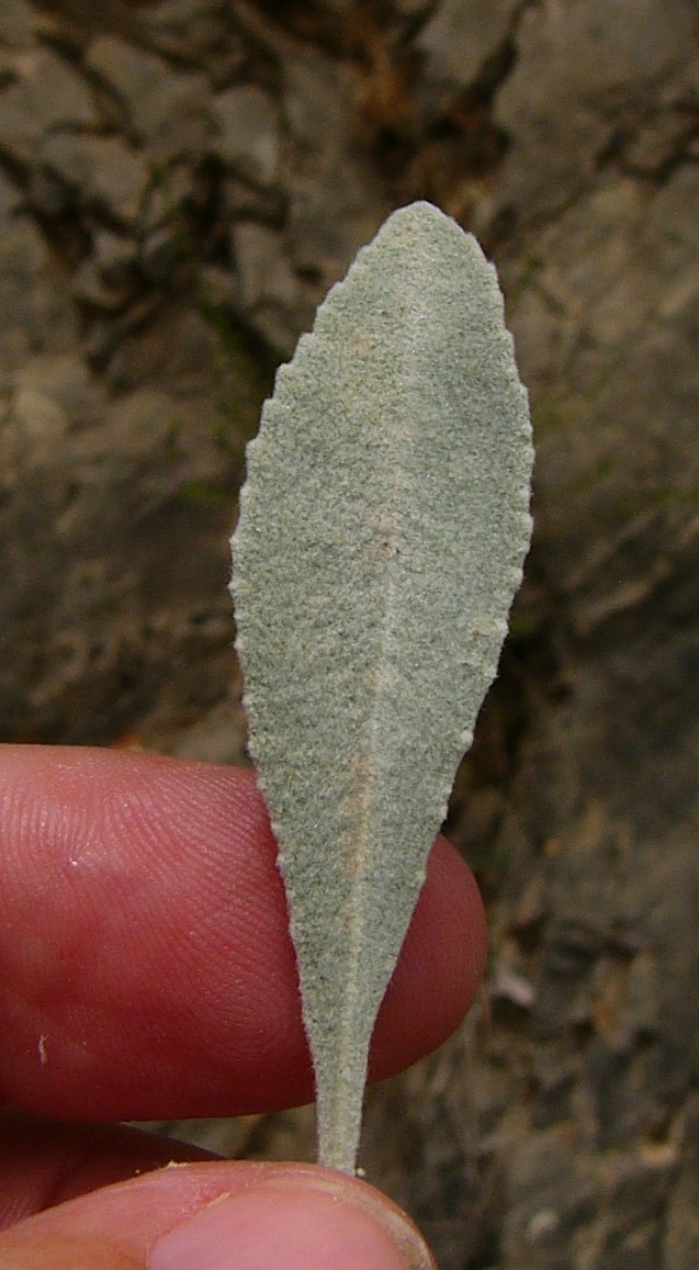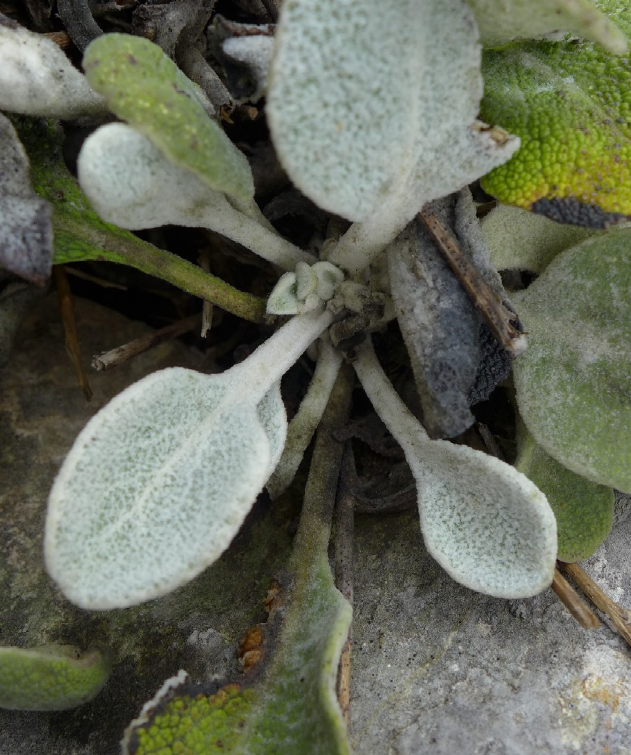 Blätter 3 - 5 cm lang, ca. 3 cm breit, dicht weißfilzig behaart,