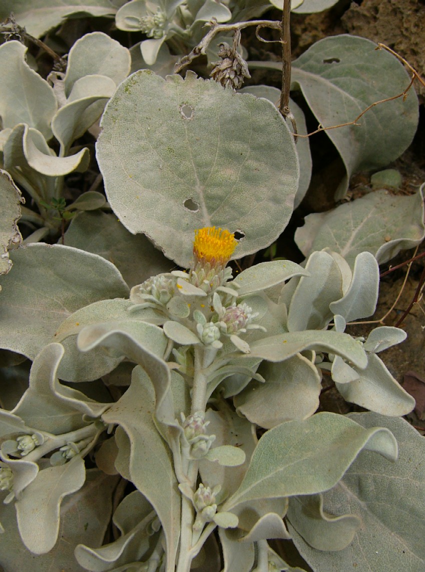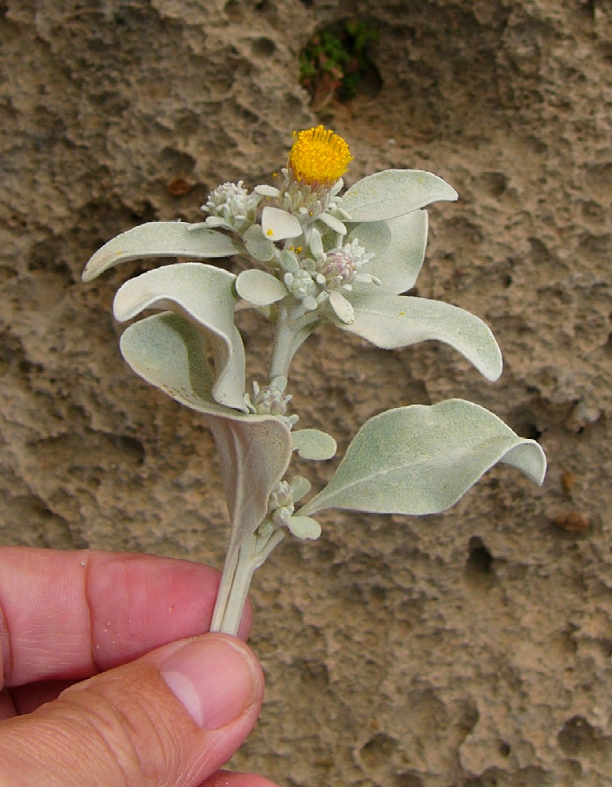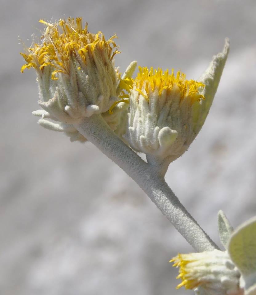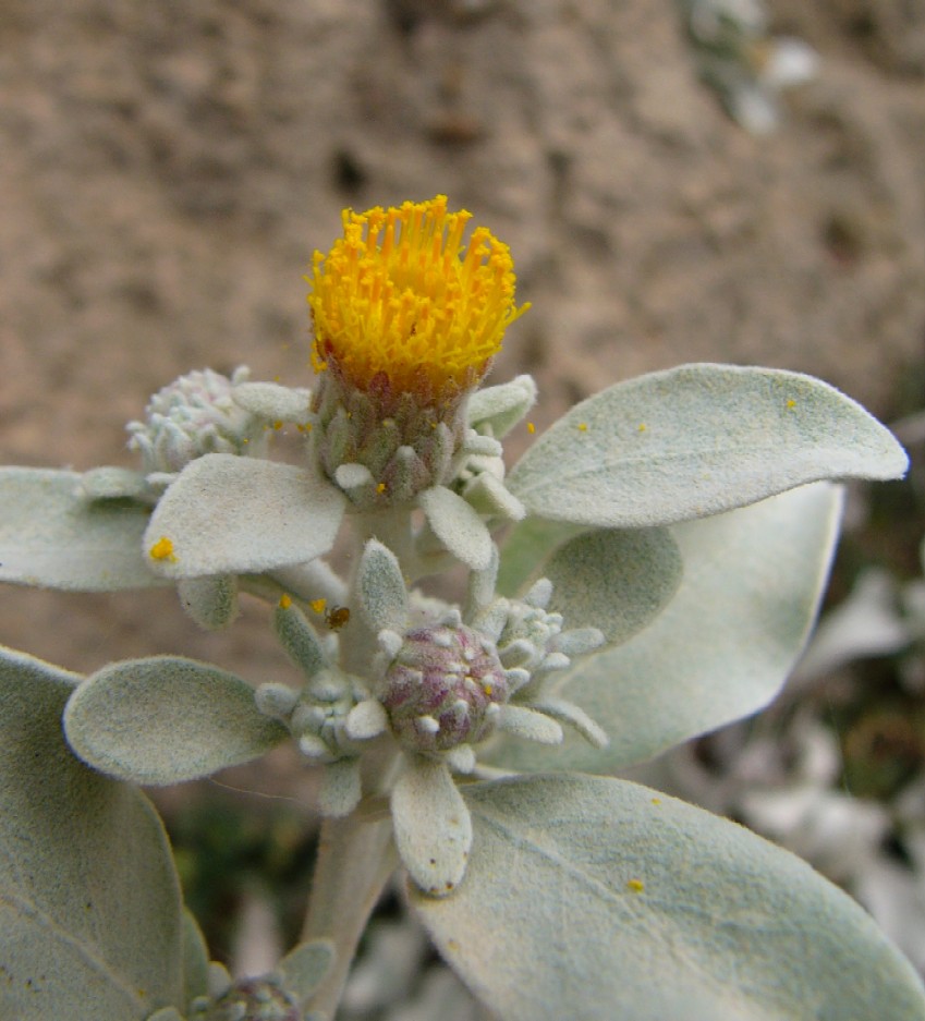 Inula - Pflanze schneeweiß filzig behaart, Zungenblüten nicht sichtbar, kürzer als die Hülle Blätter ganzrandig