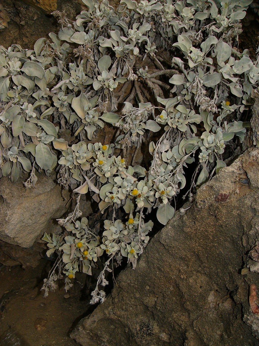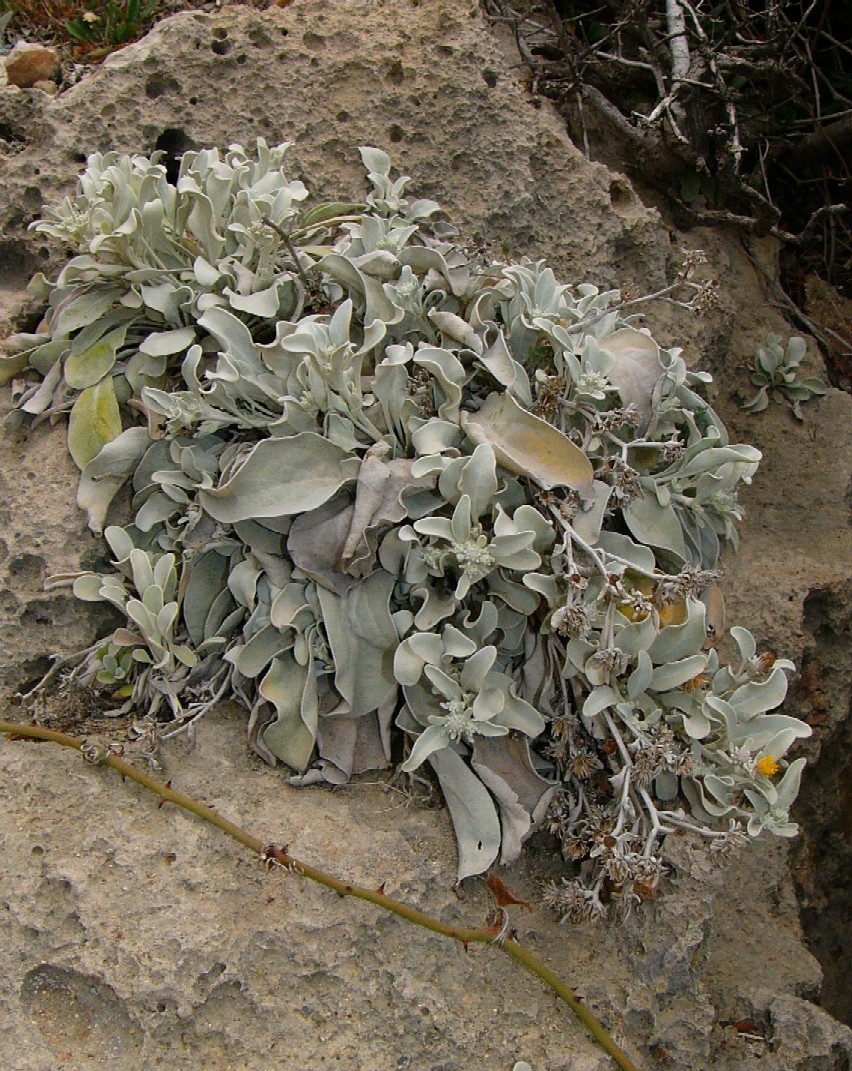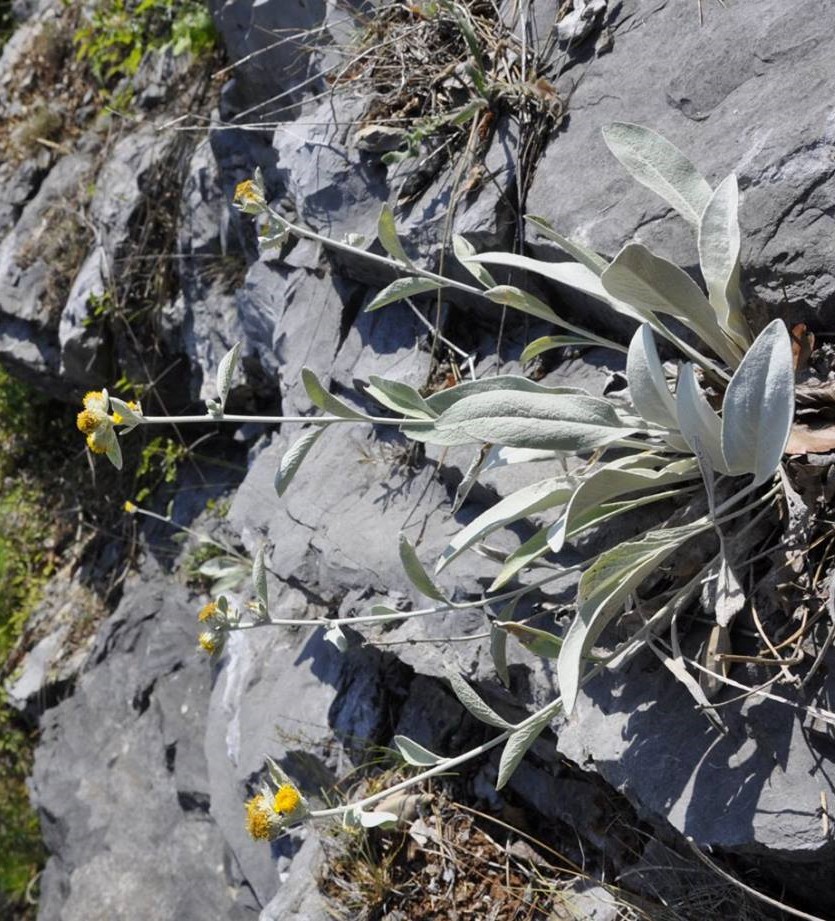 Inula - Pflanze schneeweiß filzig behaart, Zungenblüten nicht sichtbar, kürzer als die Hülle Blätter ganzrandig