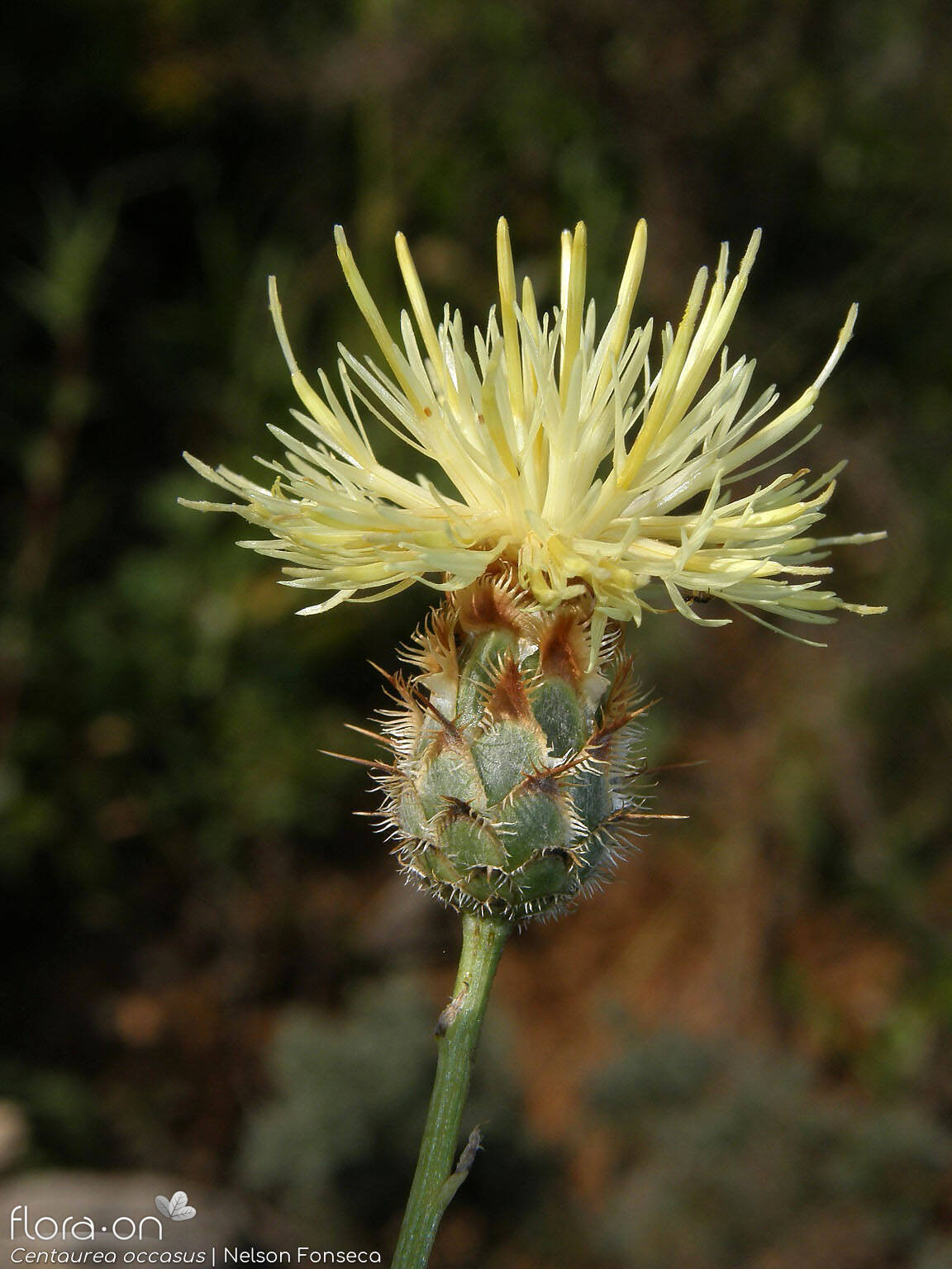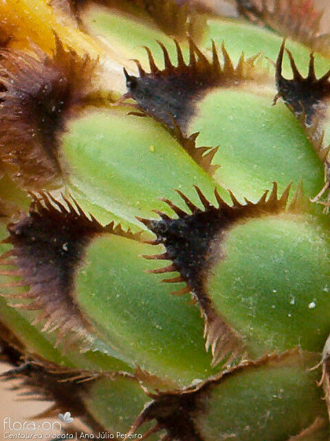 Hüllblätter grün, locker spinnwebig behaart, Anhängsel schwarzbraun, an den Hüllblättern herablaufend, mit 7 - 10 Paar 1,5 - 3 mm langen Fimbrien, Enddorn 2 - 7 mm lang, stechend, meist zurückgebogen