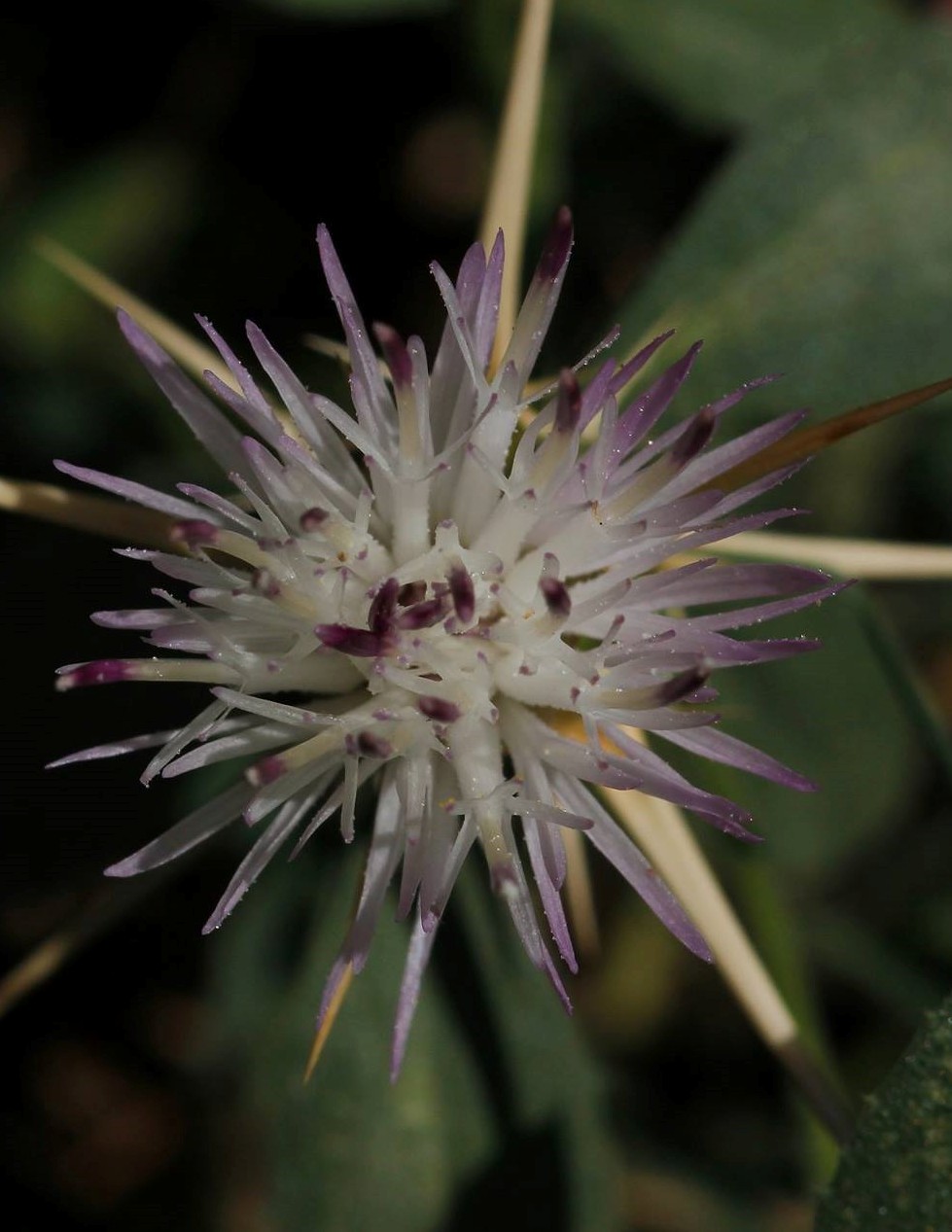 Äußere Blüten steril, violett, innere Blüten weißlich, zwittrig, oft von ganzrandigen oder schwach gelappten, unbedornten Hochblättern umgeben