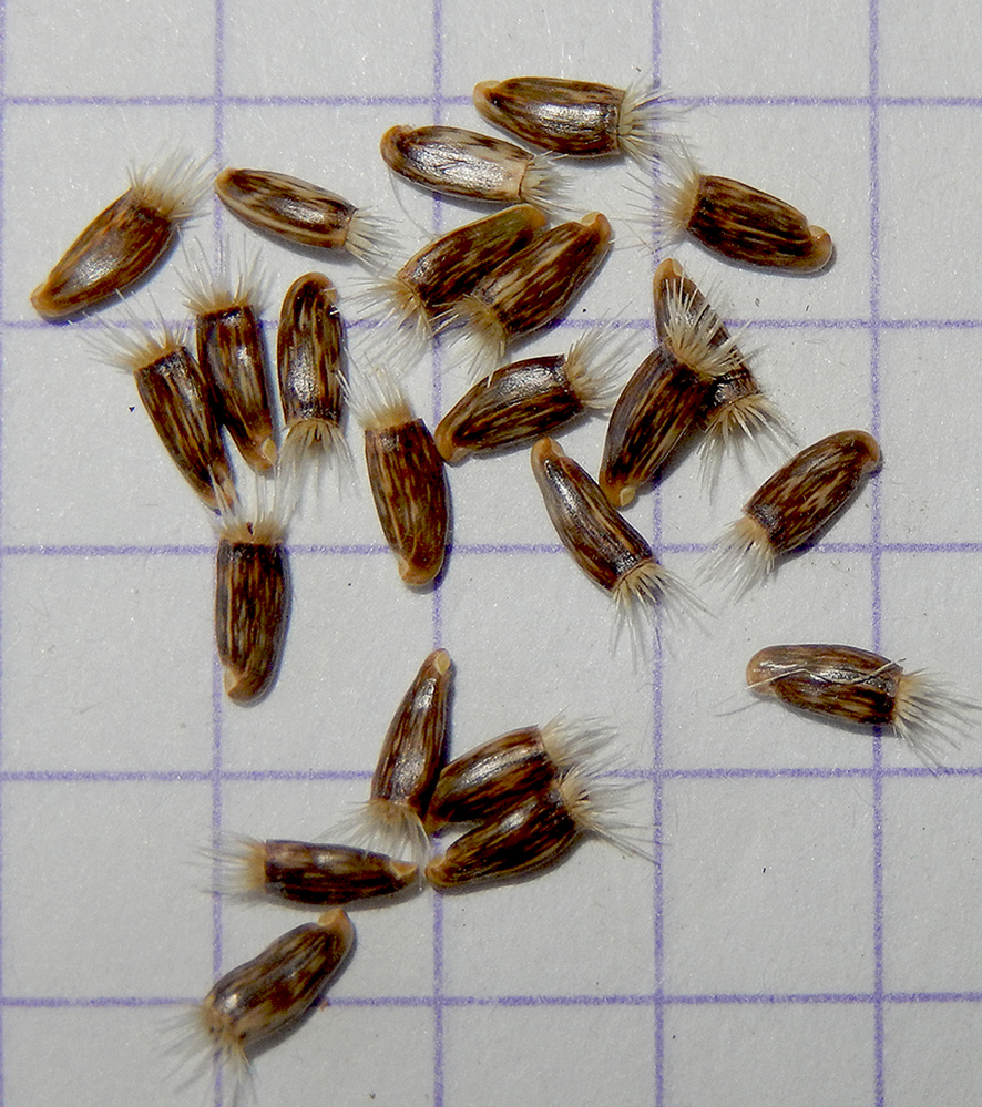 Früchte ca. 2,5 mm lang, marmoriert, mit einigen feinen, langen Haaren, ohne Pappus