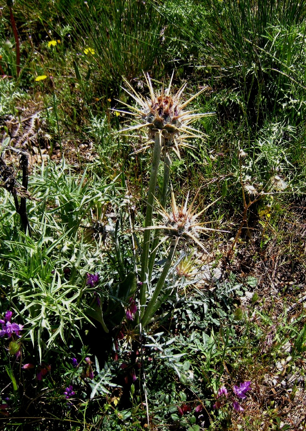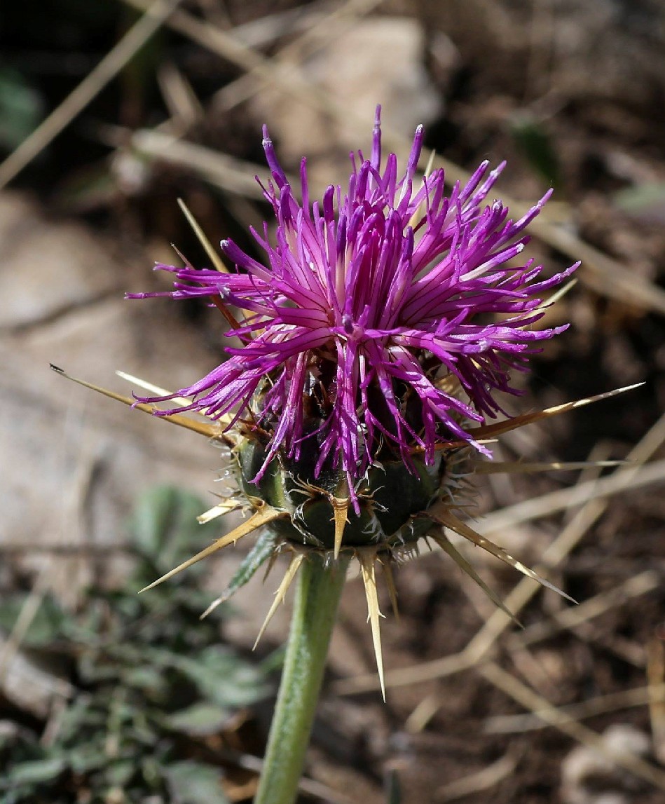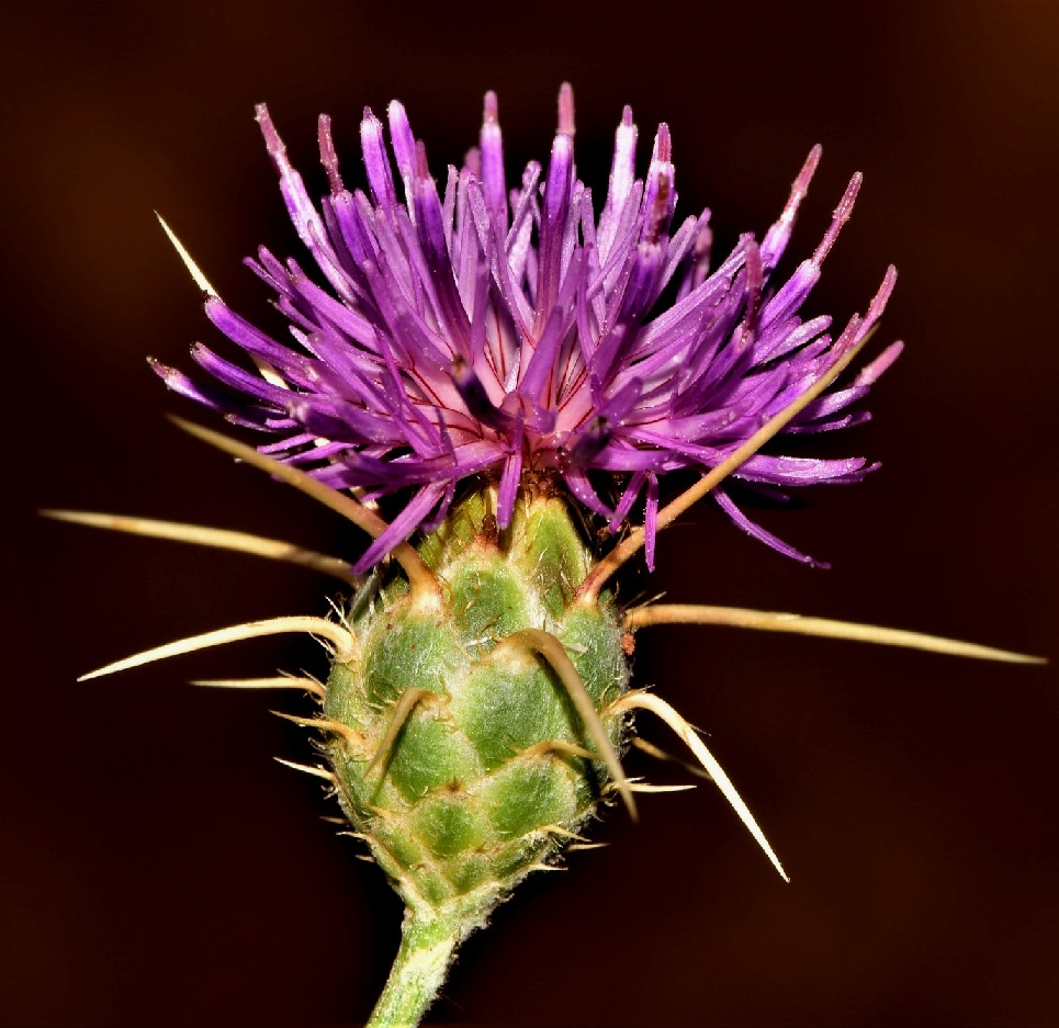 Blüten rosa oder violett, drüsig, die inneren länger als die äußeren, Hülle 15 - 40 mm im Durchmesser, eiförmig bis kugelig, Hüllblätter grün kahl, mit gelblichen Fimbrien, Anhängsel fast nur aus einem bis zu 20 mm langem Enddorn bestehend, Enddorn der Anhängsel am Grund verbreitert