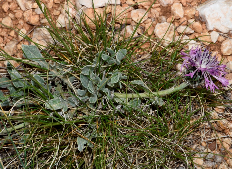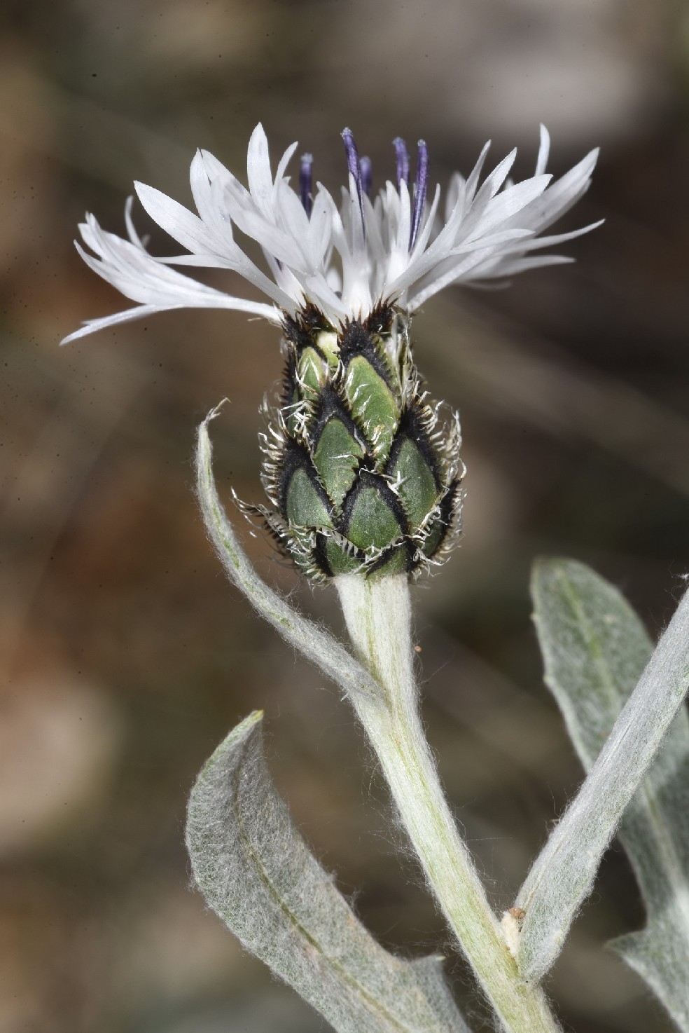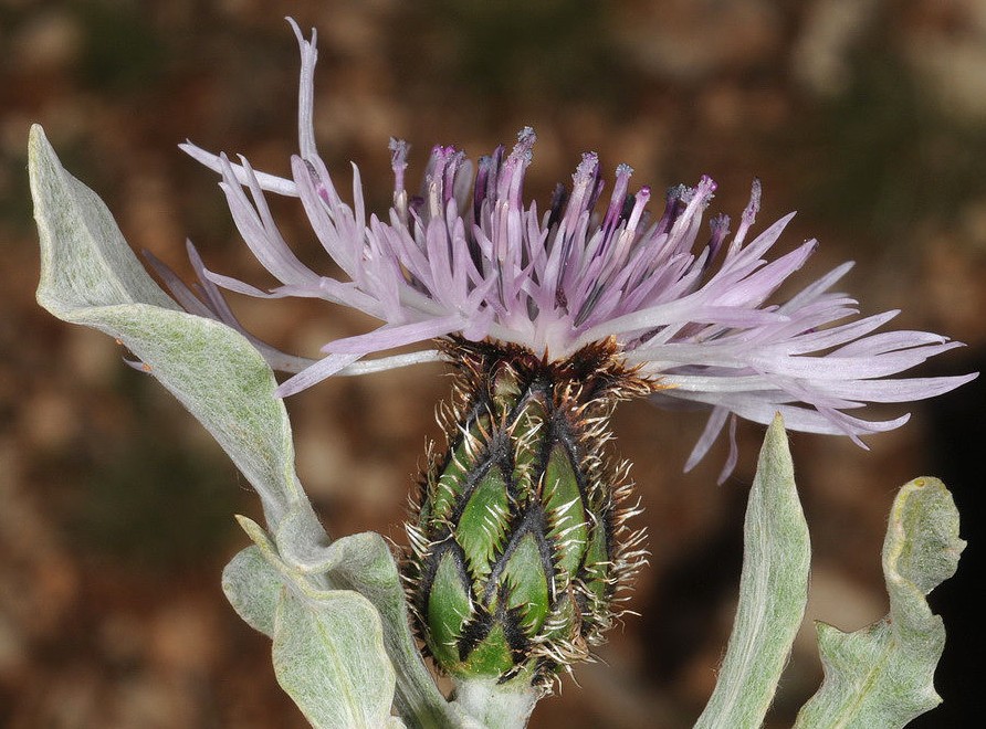 Blüten rosaviolett, deutlich strahlend, Hülle eiförmig, 17 - 20 mm lang, 8 - 11 mm breit, Hüllblätter grün, mit schwarzbraunen, heranlaufenden Anhängseln, Zähne der Anhängsel 1 - 2 mm lang, goldfaren, höchstens an den Spitzen silbern
