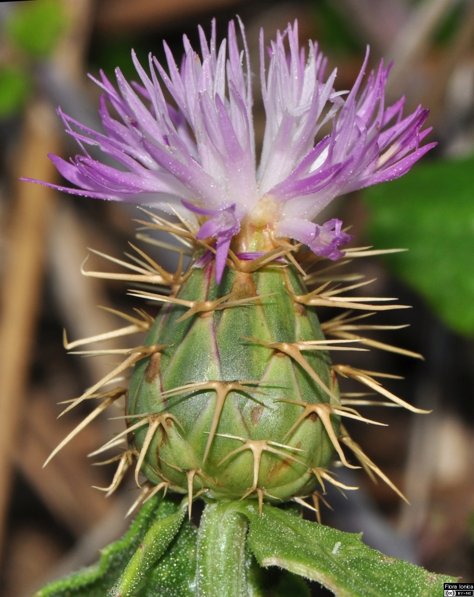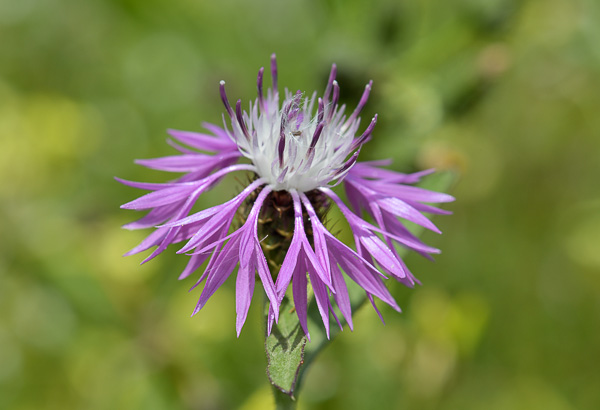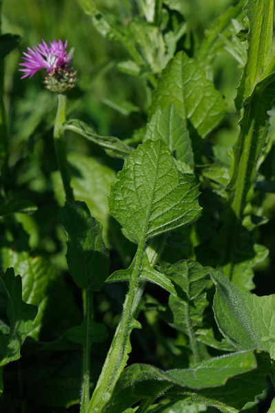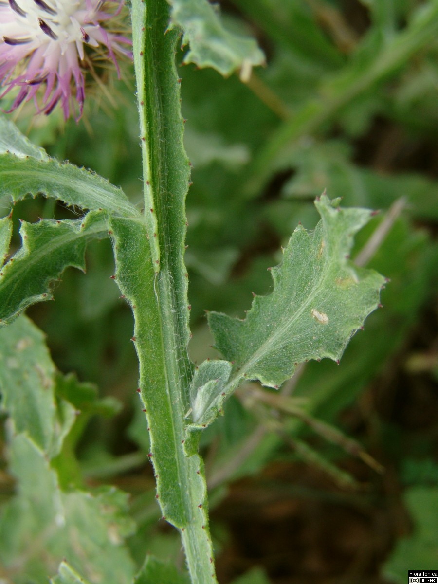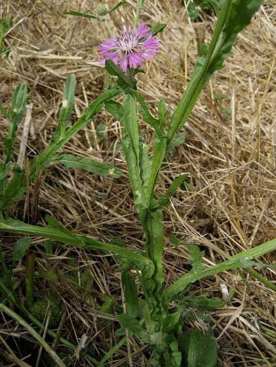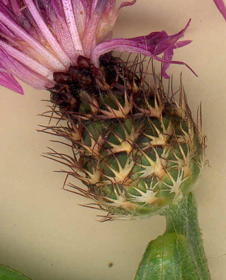 Centaurea - Pflanze mit deutlichem Stängel, Blüten weiß oder violett, Hüllblattanhängsel mit 5 - 22 +/- gleich langen, kräftigen Dornen, Enddorn 5 - 14 mm lang, Dornen der Anhängsel einreihig, in einer Ebene, Blätter am Stängel herablaufend