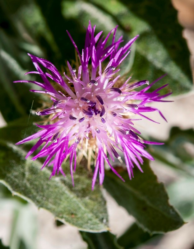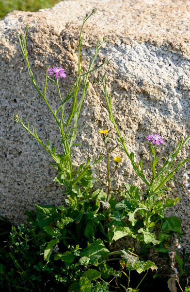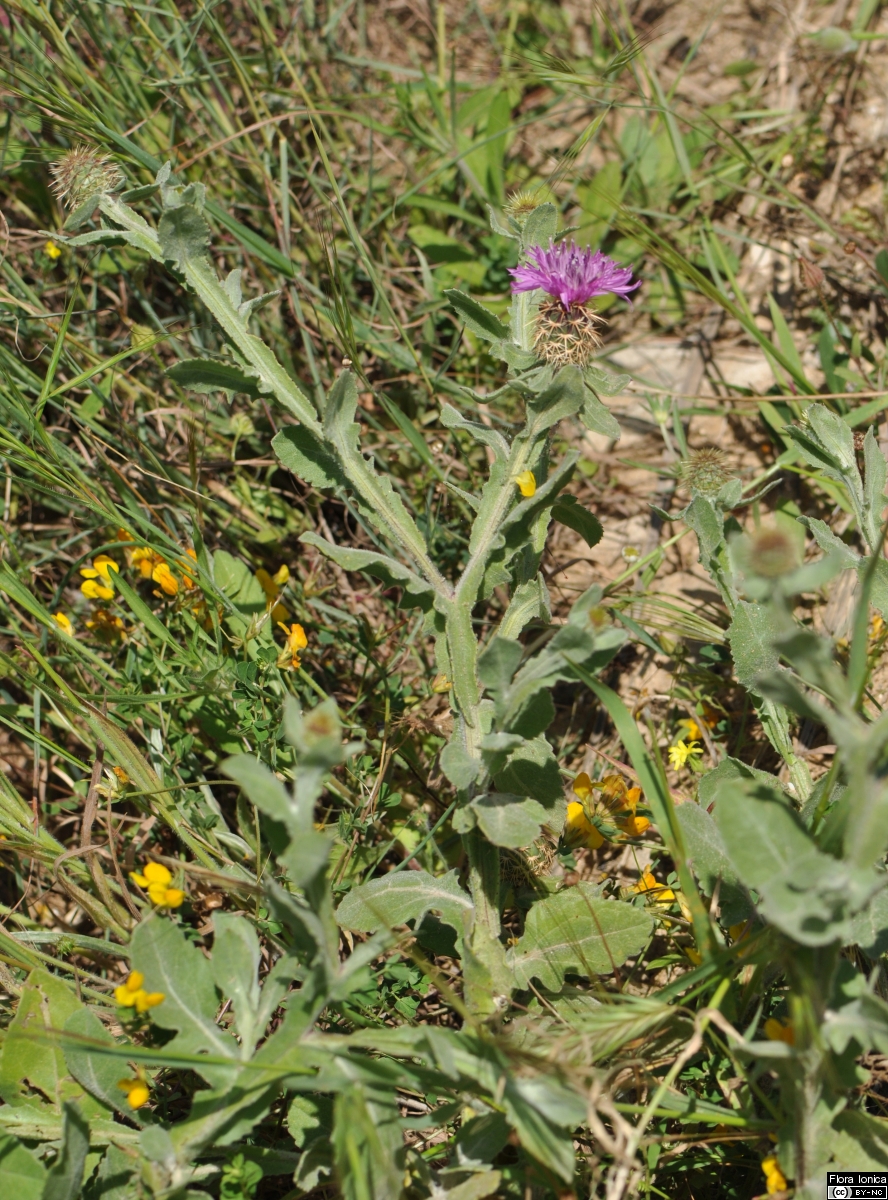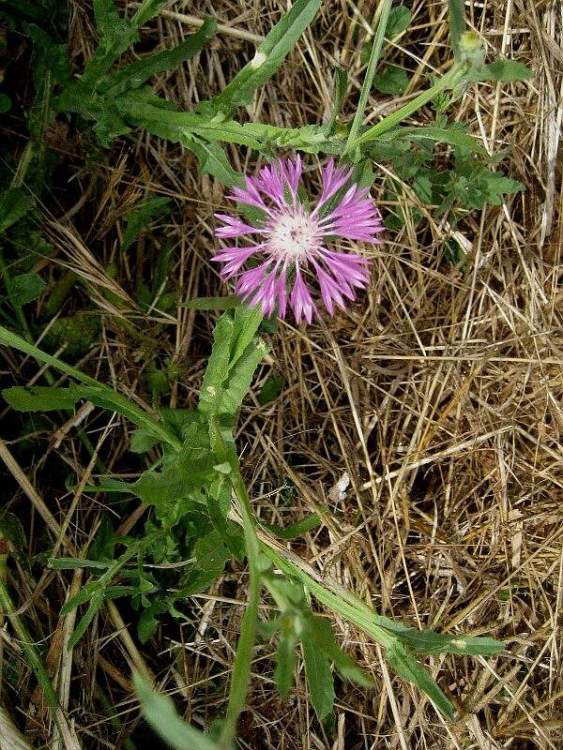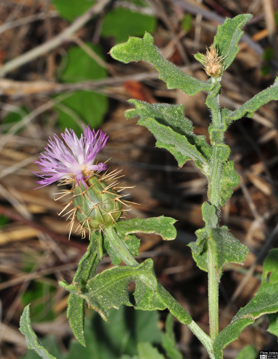 Centaurea - Pflanze mit deutlichem Stängel, Blüten weiß oder violett, Hüllblattanhängsel mit 5 - 22 +/- gleich langen, kräftigen Dornen, Enddorn 5 - 14 mm lang, Dornen der Anhängsel einreihig, in einer Ebene, Blätter am Stängel herablaufend