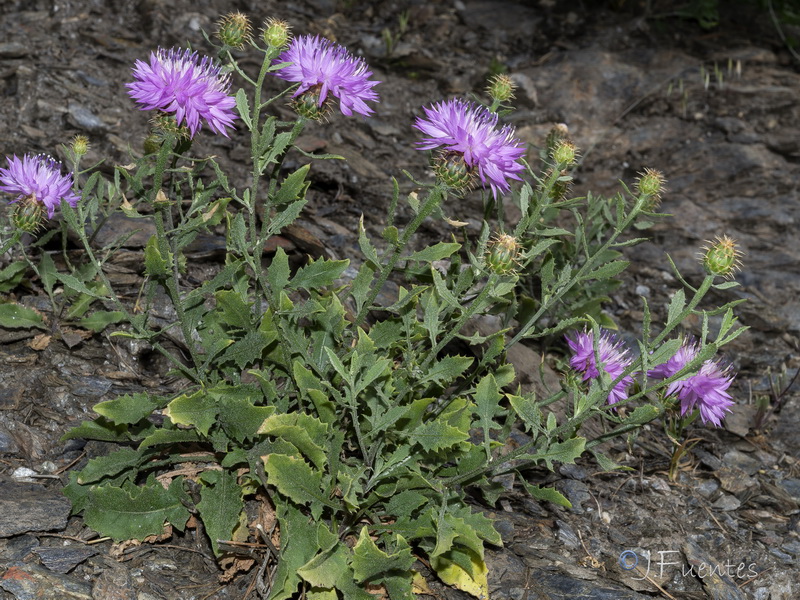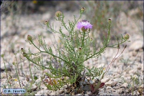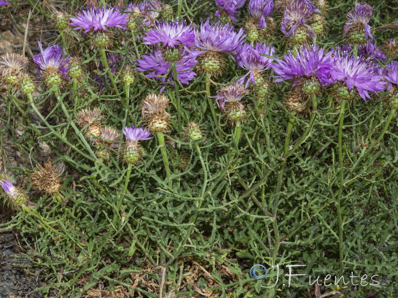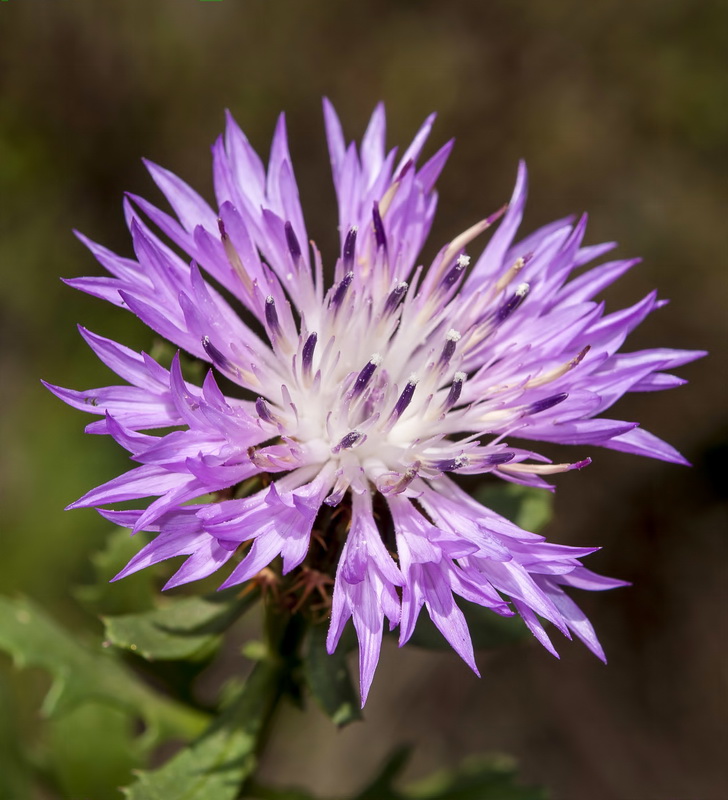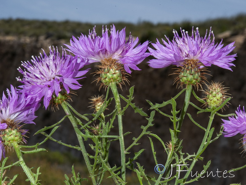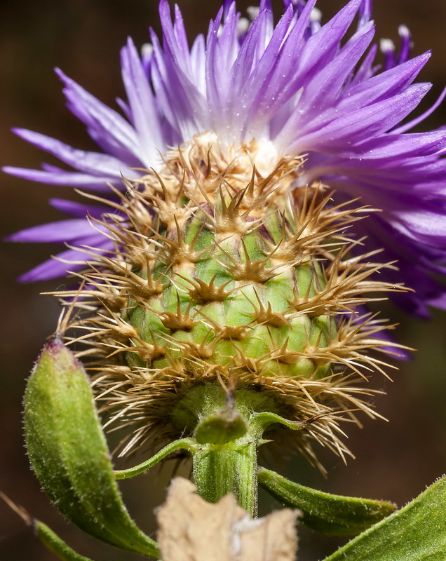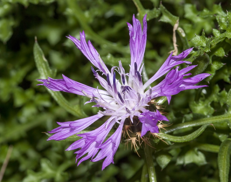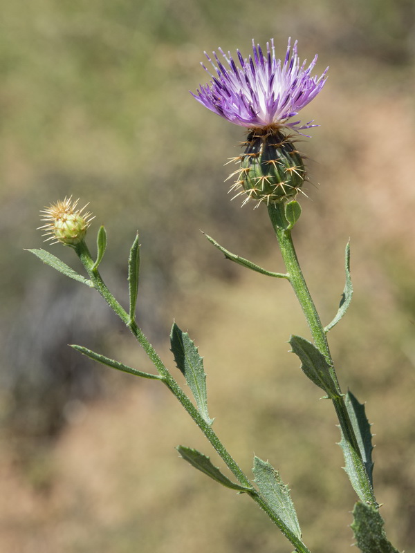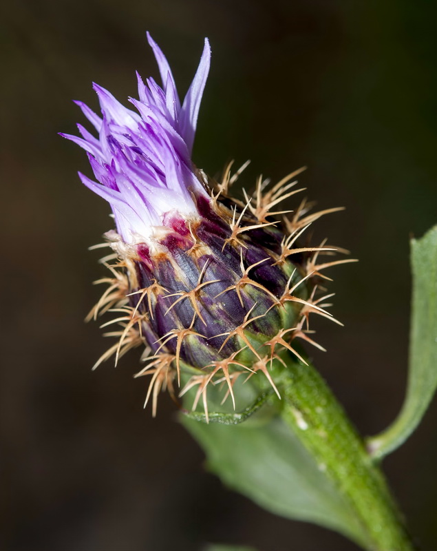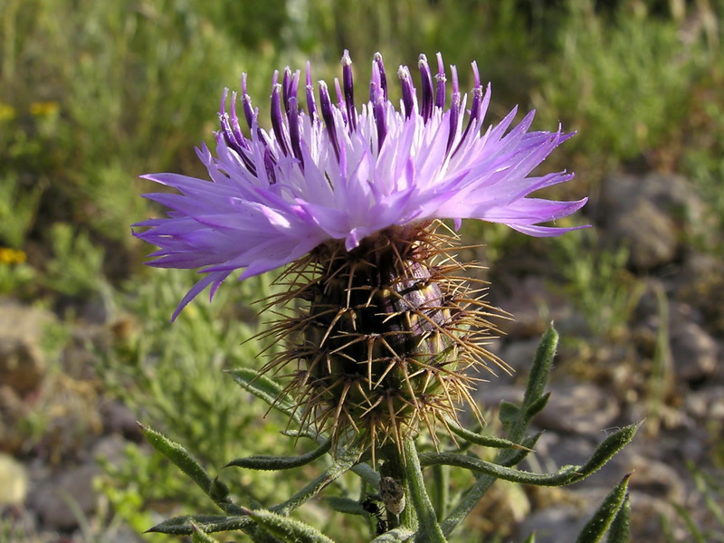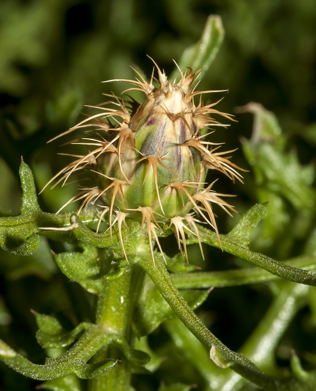 Centaurea - Pflanze mit deutlichem Stängel, Blüten weiß oder violett, Hüllblattanhängsel mit 5 - 22 +/- gleich langen, kräftigen Dornen, Enddorn 5 - 14 mm lang, Dornen der Anhängsel einreihig, in einer Ebene, Blätter nicht am Stängel herablaufend