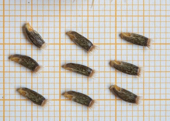 Frucht ca. 4,5 mm lang, schwach seidig behaart Blätter 13 cm lang, 4 cm breit, fiederteilig