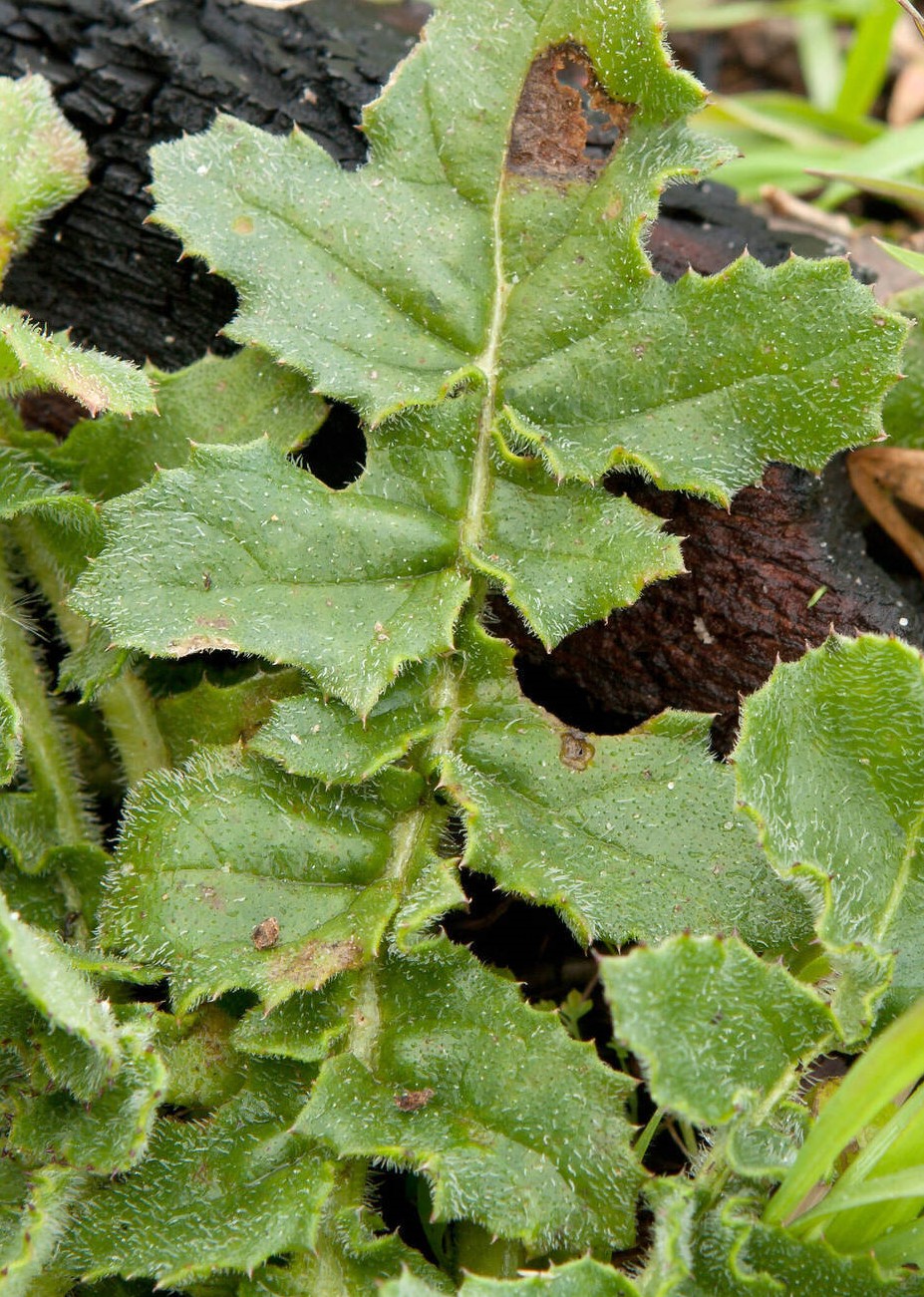 Frucht 5 - 6 mm lang, längsrillig, locker seidig behaart, ohne Pappus Obere Blätter stängelumfassend