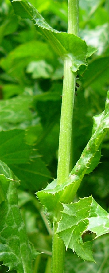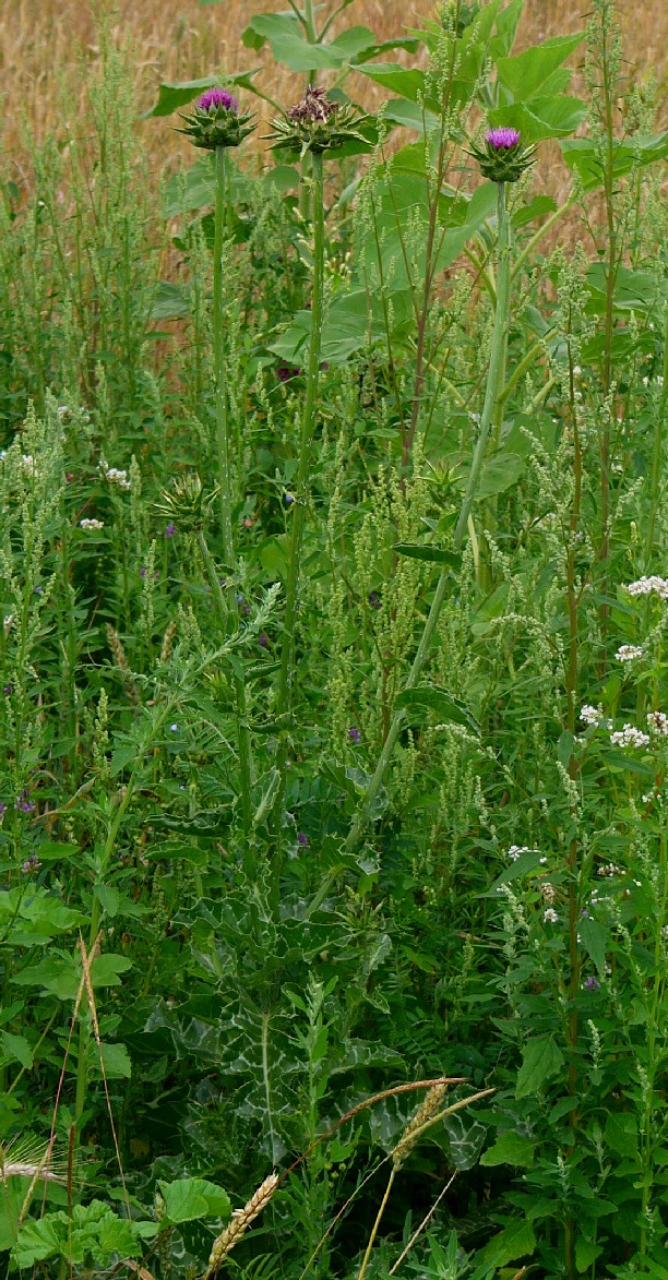 Pflanze 60 - 250 cm groß Hüllblätter mit großem, stachlig gezähntem Anhängsel Blätter weiß gefleckt, glänzend, Stängel ungeflügelt