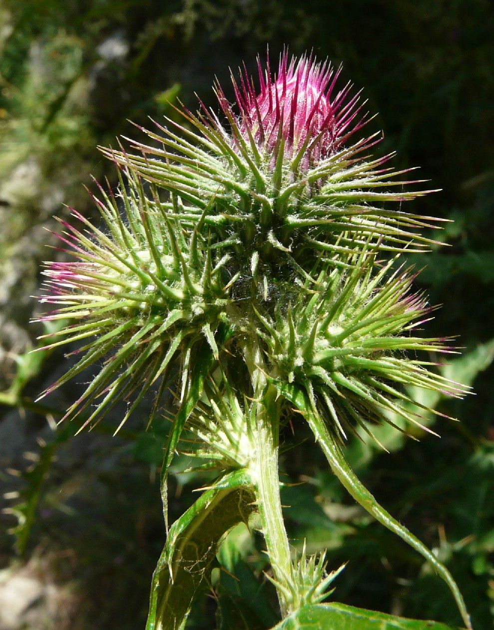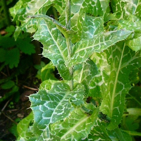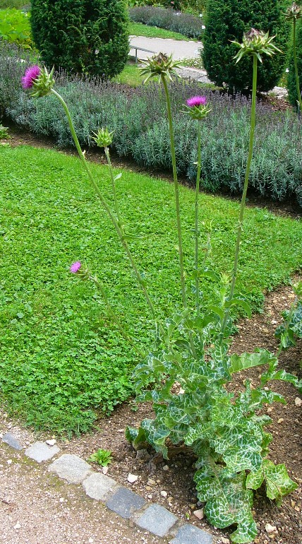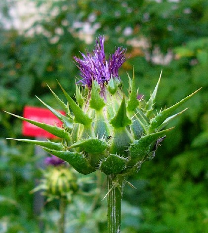 Asteraceae - innere Hüllblätter nicht zungenblütenähnlich, Blüten violett, Blätter dornig, mit weißer Zeichnung
