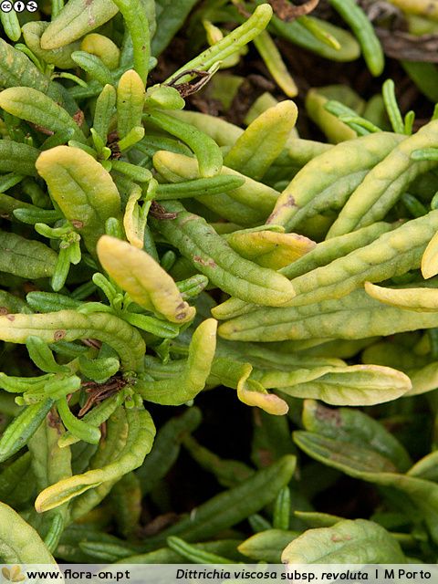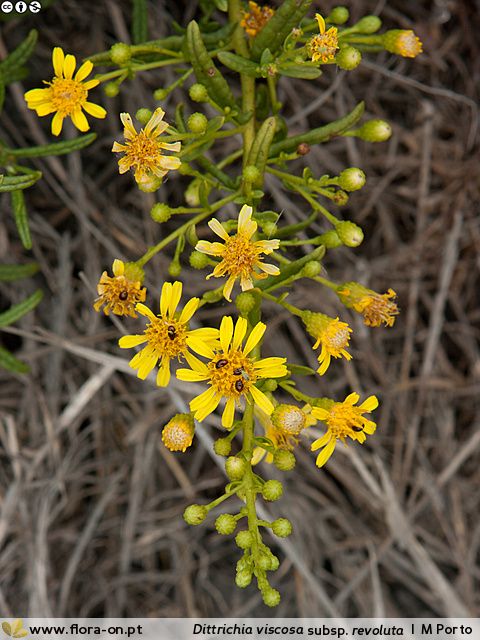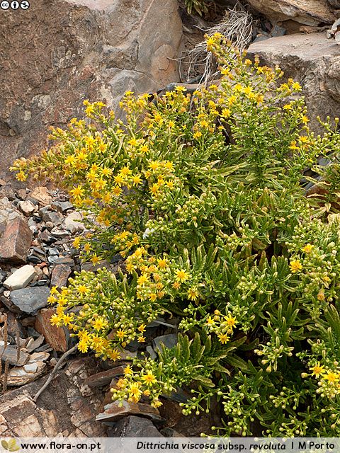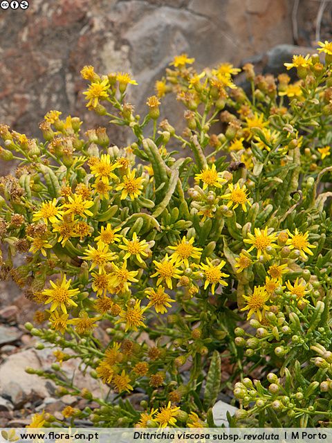 Ruderalstellen, Felsen, Mauern (0 - 165 m) Synonyme: English name: Weltweite Verbreitung: Nach Aussage von Miguel Porto ist es nicht 100 % sicher, dass Dittrichia viscosa ssp maritima und Dittrichia viscosa ssp revoluta wirklich verschiedene Unterarten sind.