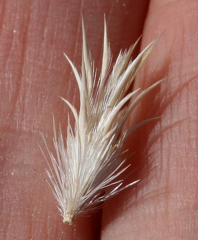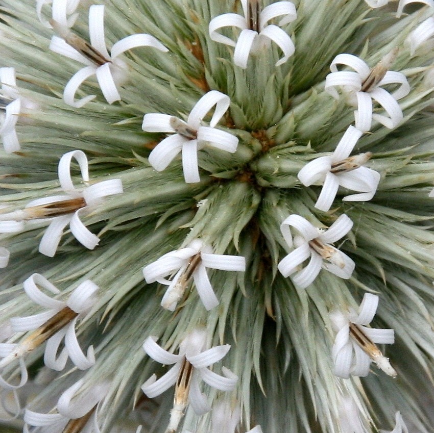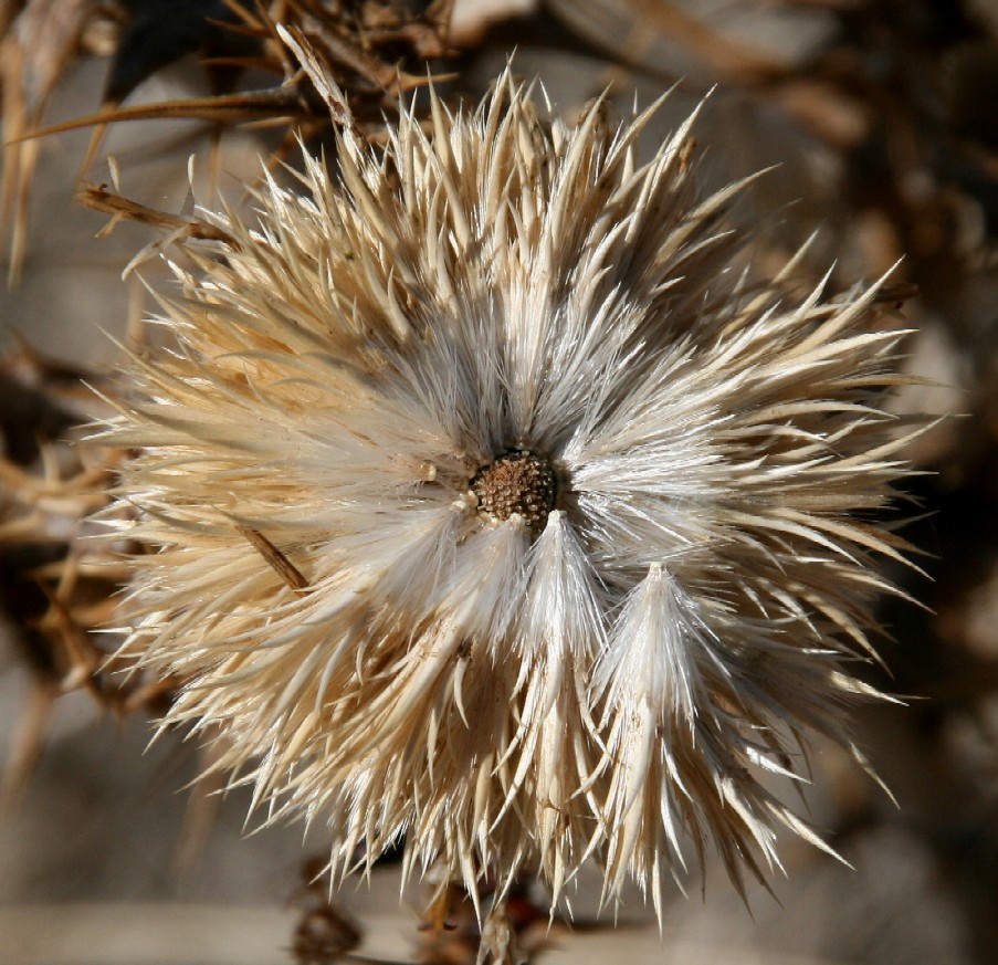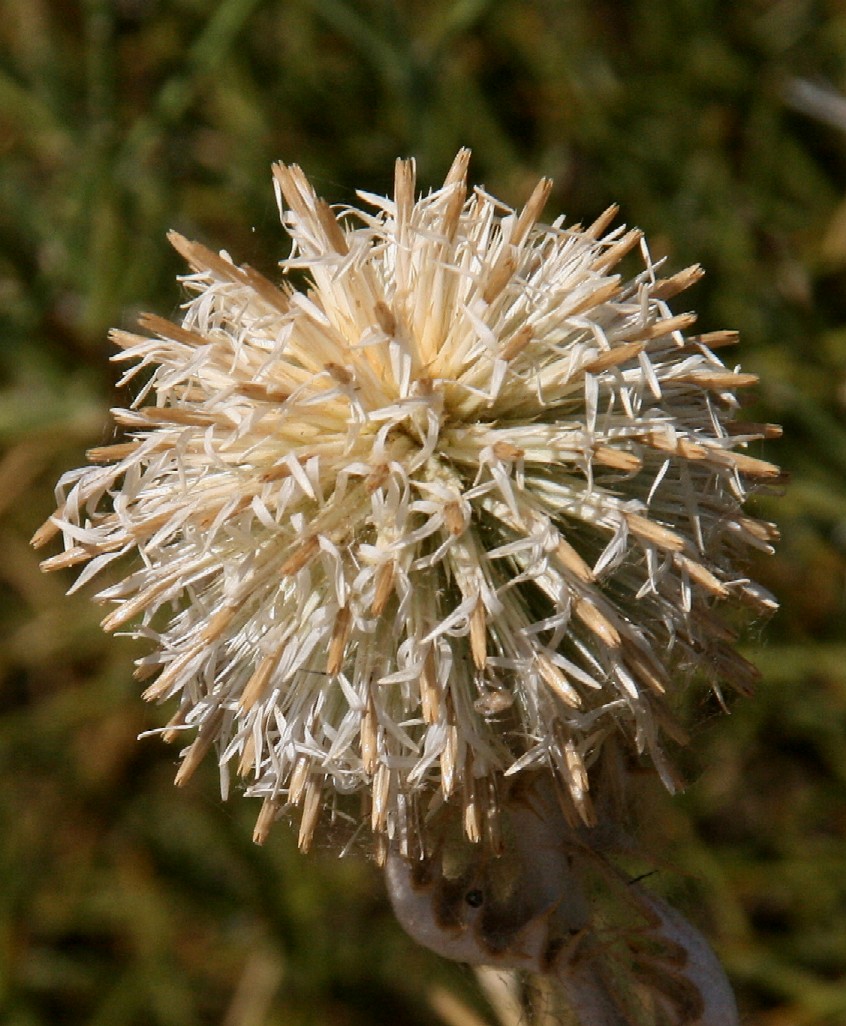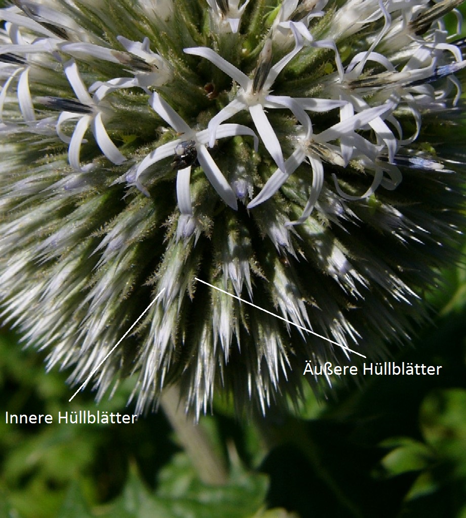 Zur Fruchtzeit sitzen die einzelnen Körbe mit kurzen Stielchen auf dem gemeinsamen kugeligen Köpfchenboden Zur Fruchtzeit sieht man nur noch die stachelartigen Hüllblätter und die Borsten