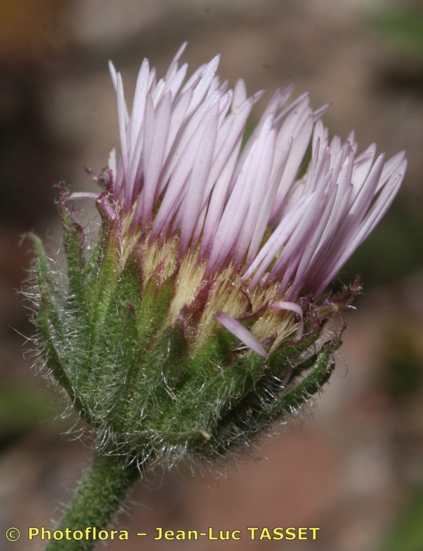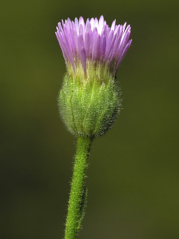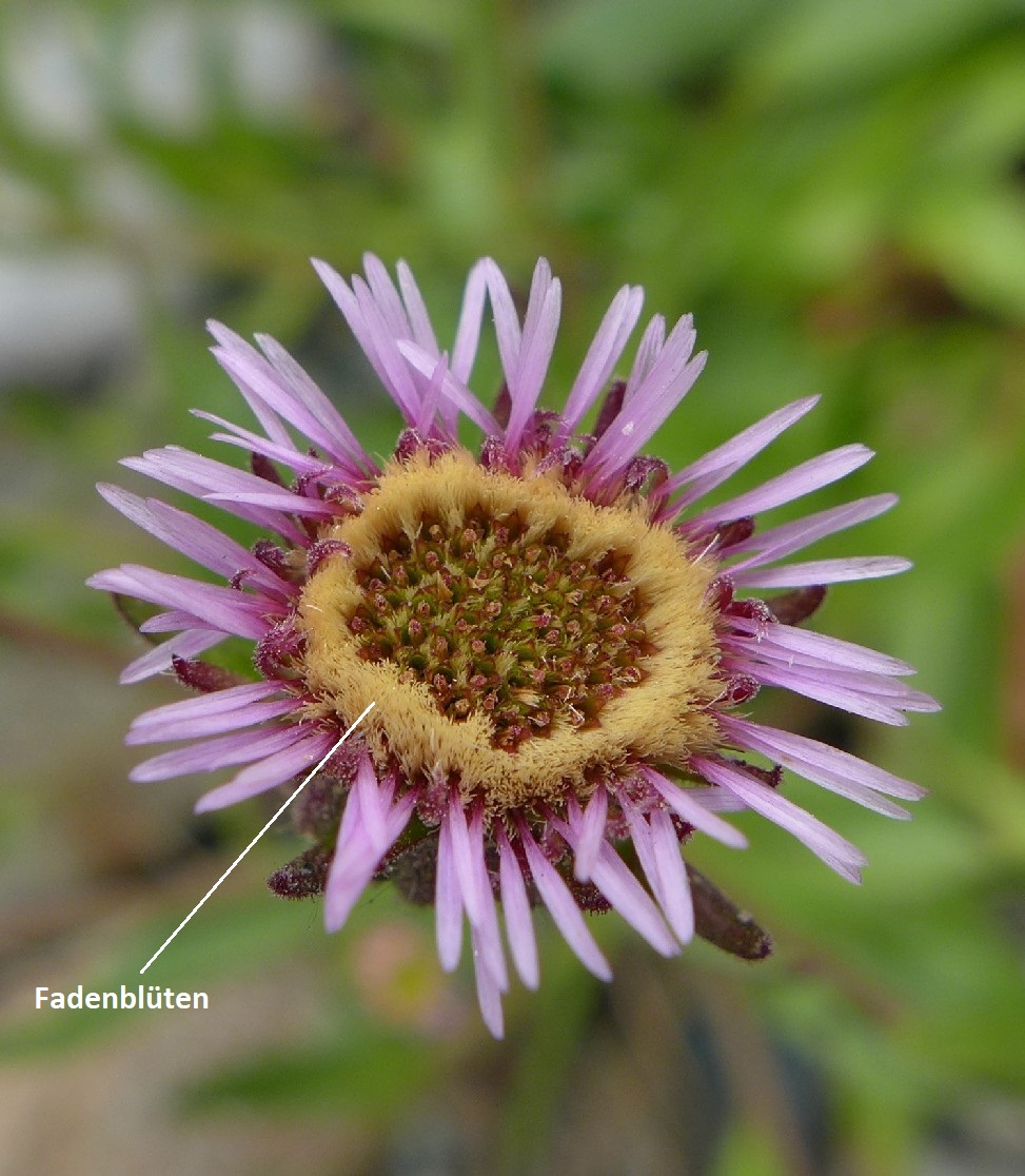 Köpfchen ohne Fadenblüten, Zungenblüten abstehend, rosaviolett 6 - 7 mm lang