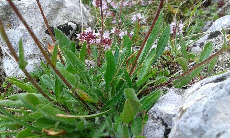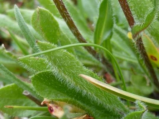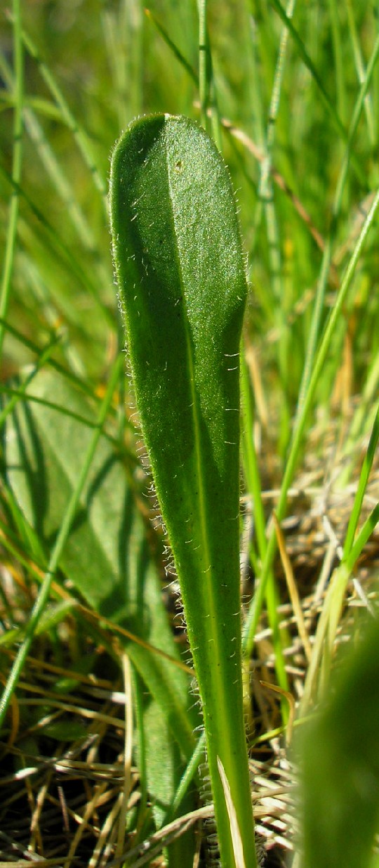 Grundblätter spatelförmig, 20 - 55 mm lang, 4 - 6 mm breit, mit geflügelten Stiel, vorne abgerundet, etwas fleischig, auf der Fläche fast kahl, am Rand gewimpert
