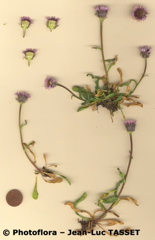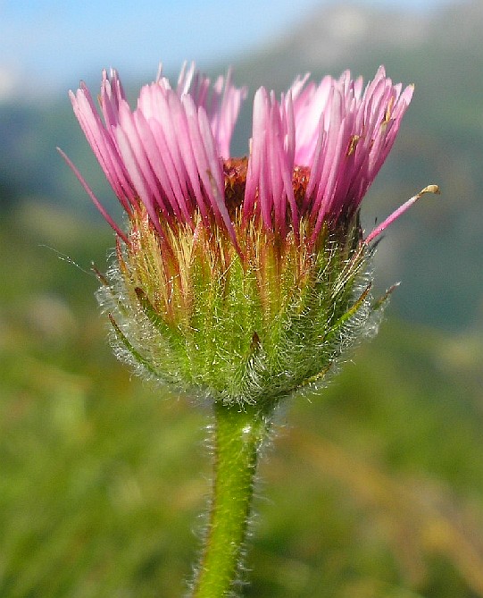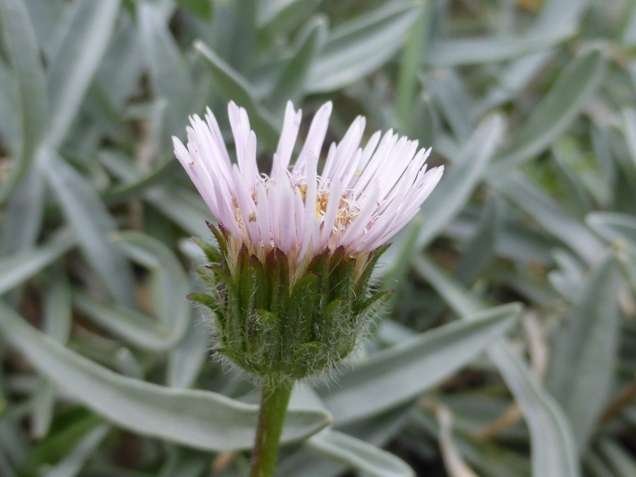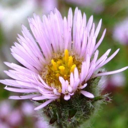 Köpfchen 12 - 22 mm im Durchmesser, zwischen Röhren- und Zungenblüten befinden sich Fadenblüten, Zungenblüten in 2 - 3 Reihen, 4 - 8 mm lang, lila, Röhrenblüten gelblich, an der Spitze oft purpurn