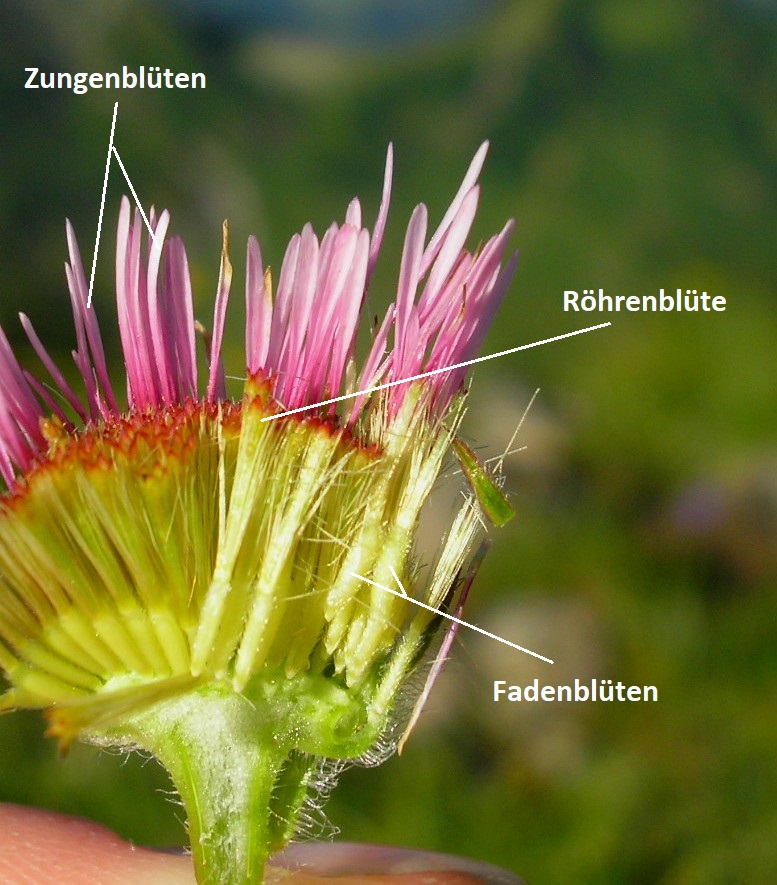 Köpfchen mit mit Fadenblüten (Fadenblüten sind rein weibliche Blüten, ohne Antherenröhre, nur mit Griffel und 2 Narben), Röhrenblüten grüngelb, im oberen Bereich orangerot