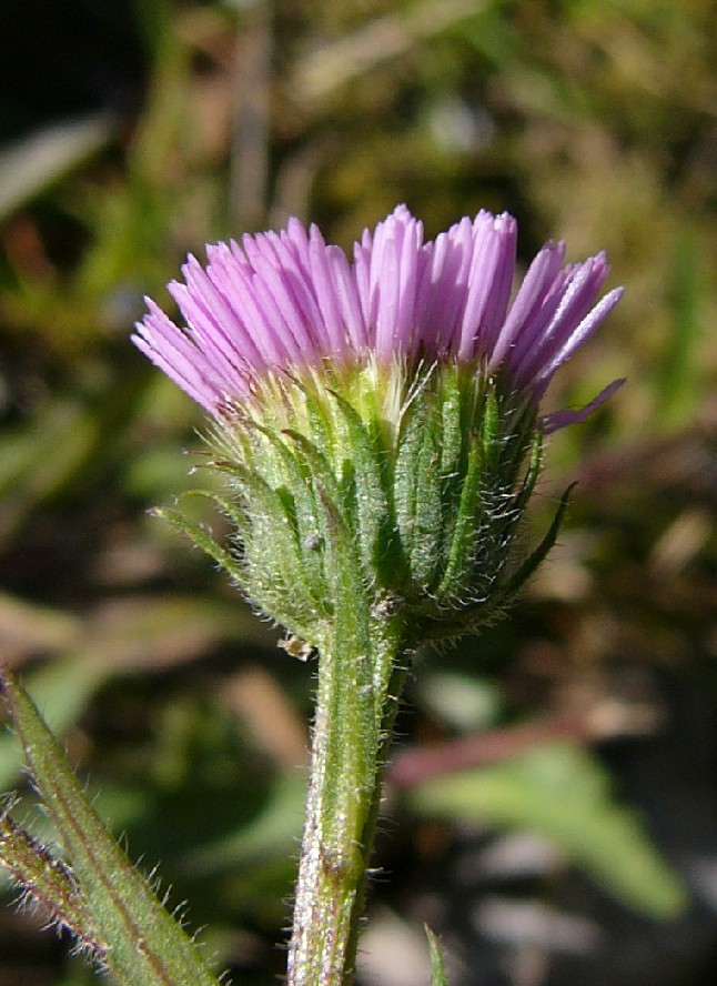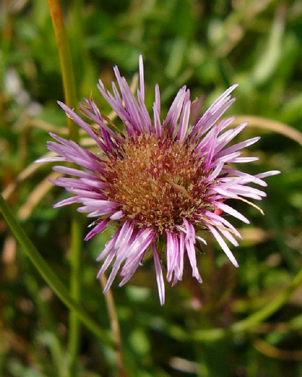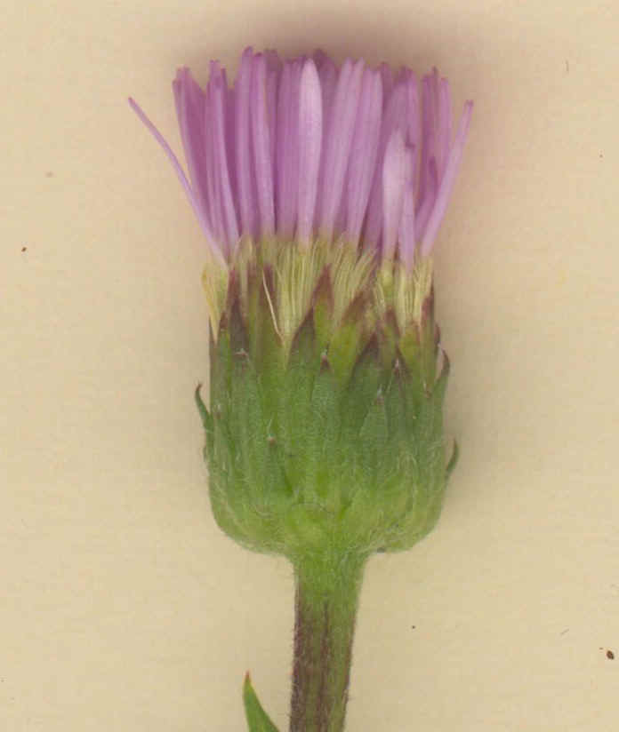 Köpfchen 12 - 22 mm im Durchmesser, zwischen Röhren- und Zungenblüten befinden sich Fadenblüten, Zungenblüten in 2 - 3 Reihen, 4 - 8 mm lang, lila, Röhrenblüten gelblich, an der Spitze oft purpurn