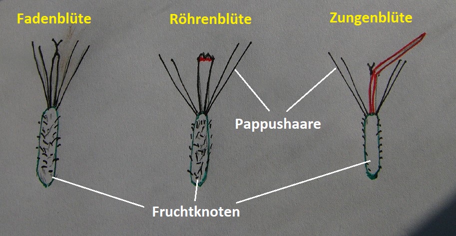 Blüten ohne Fadenblüten (die weißen Borsten sind die Pappushaare der Röhrenblüten!),