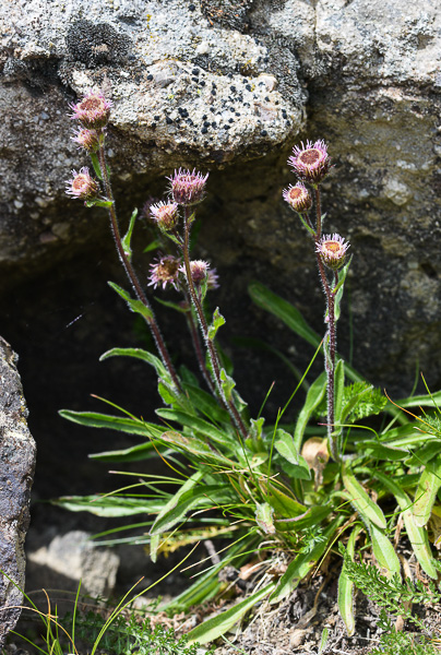 3 Endemit in Andorra, Köpfchen meist mit Fadenblüten, Stängel mit 9 - 14 Blättern, Grundblätter aufrecht