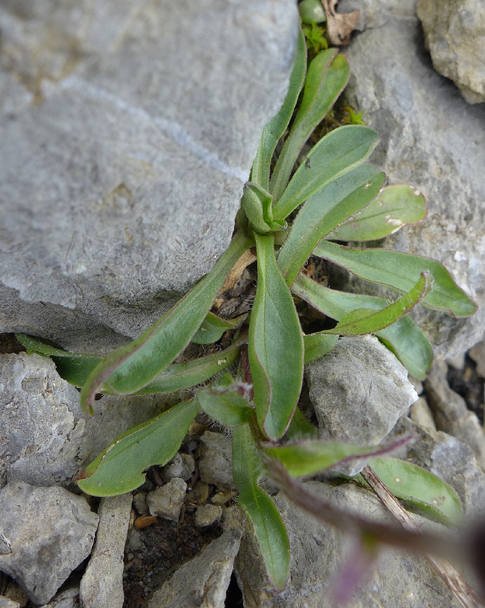 Grundblätter rosettig, ausgebreitet, zur Blütezeit vorhanden, auf der Fläche und am Rand behaart, Blattspreite 3 - 27 mm lang, 2 - 7 mm breit, lanzettlich oder spatelförmig, +/- ganzrandig, vorne stumpf, Blattstiel 3 - 28 mm lang