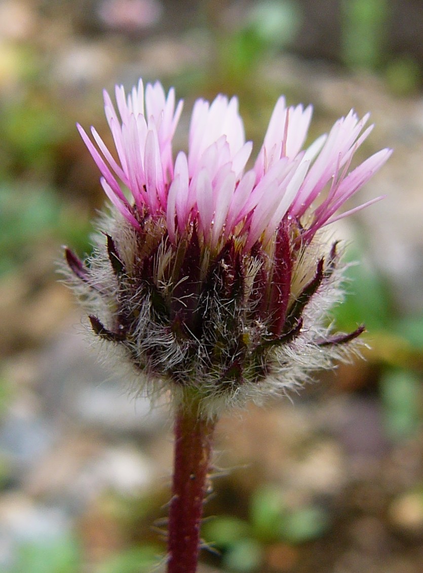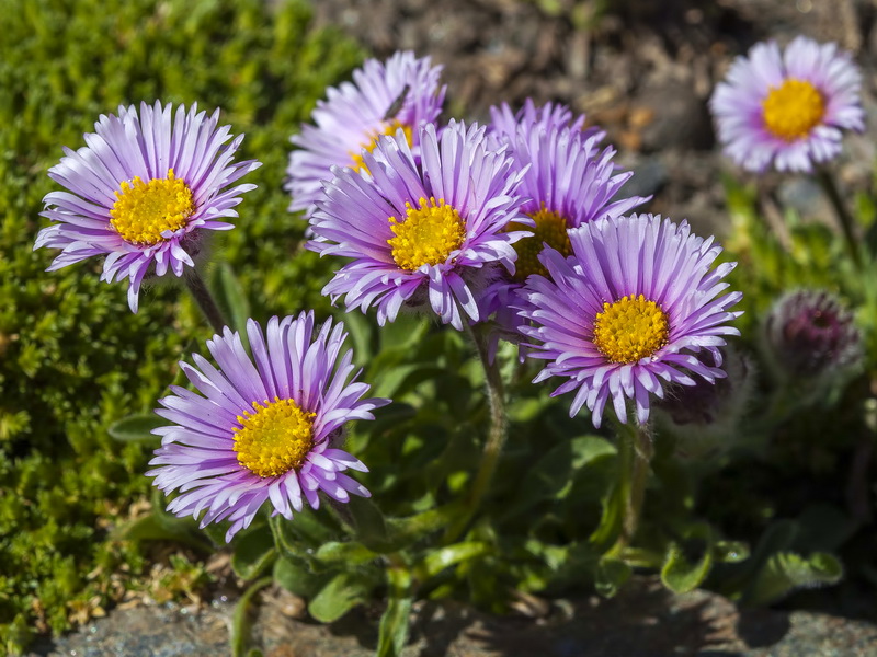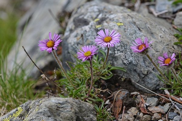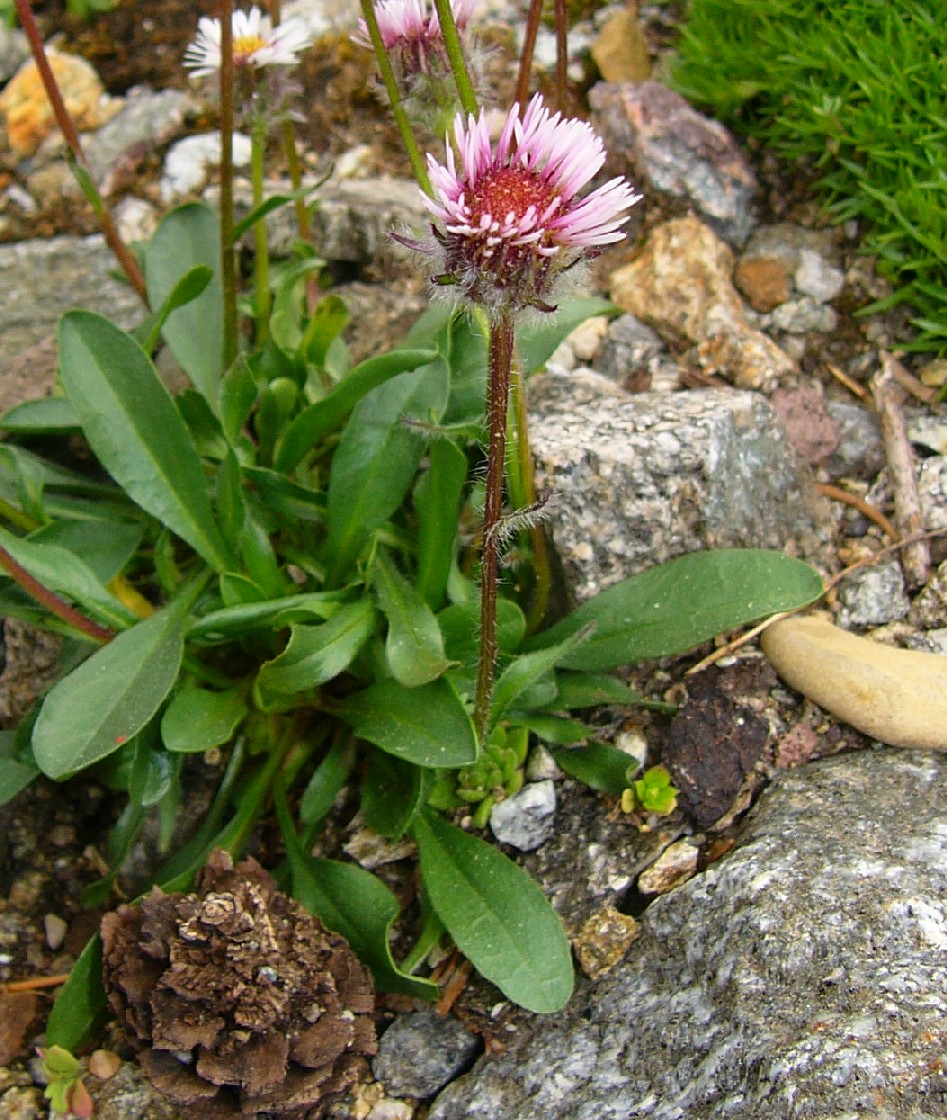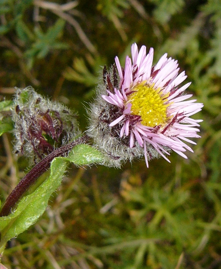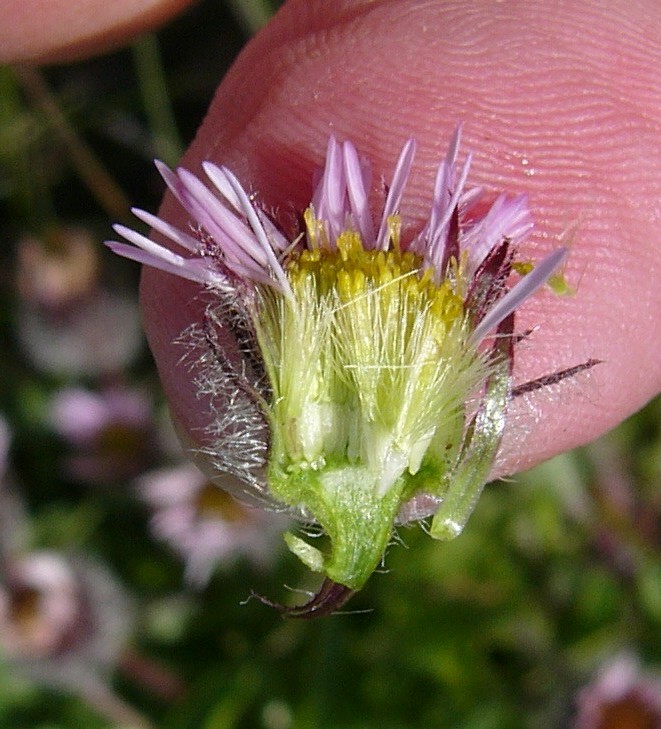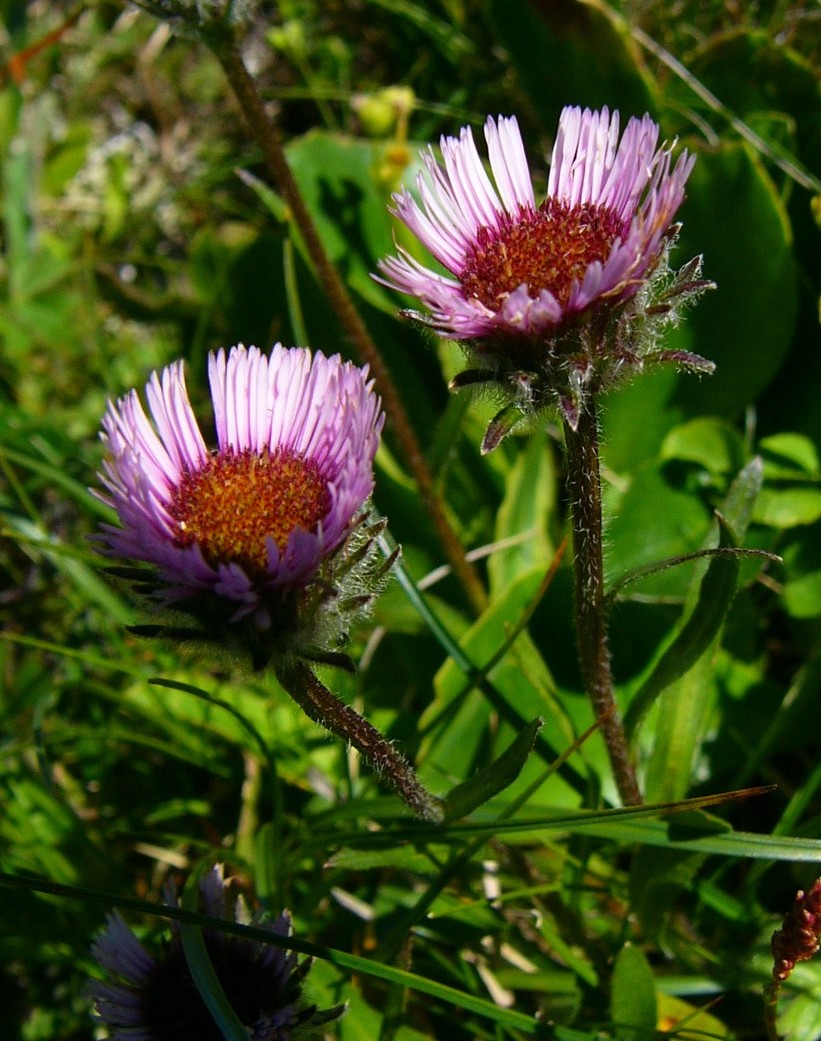 Köpfchen immer einzeln, 10 - 20 mm im Durchmesser Zungenblüten 1- 2- reihig, hellviolett, 5 - 7 mm lang, Röhrenblüten gelb, ohne Fadenblüten