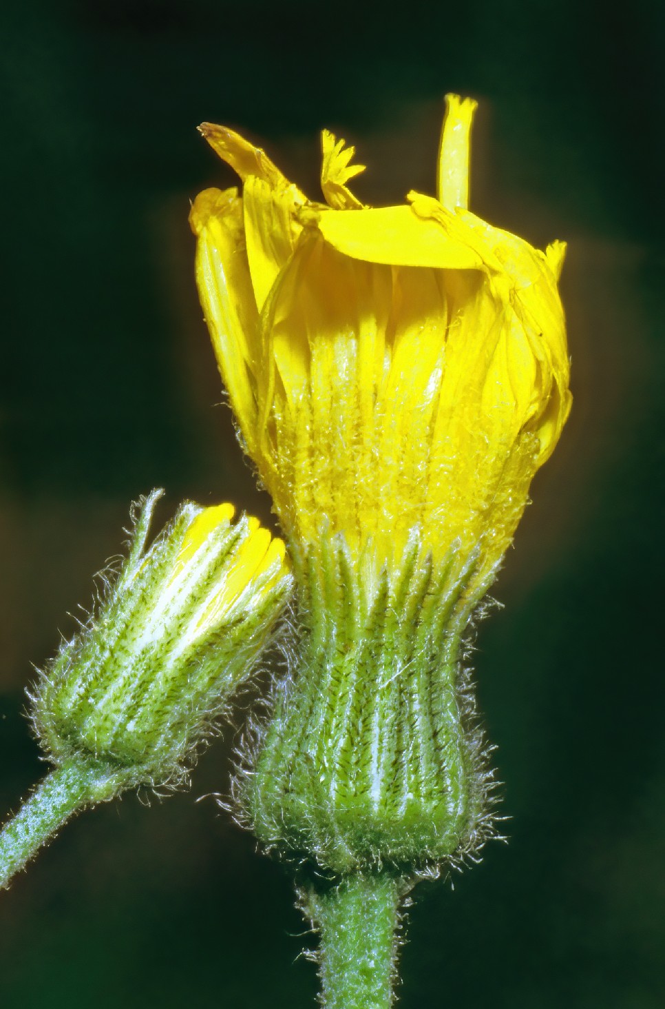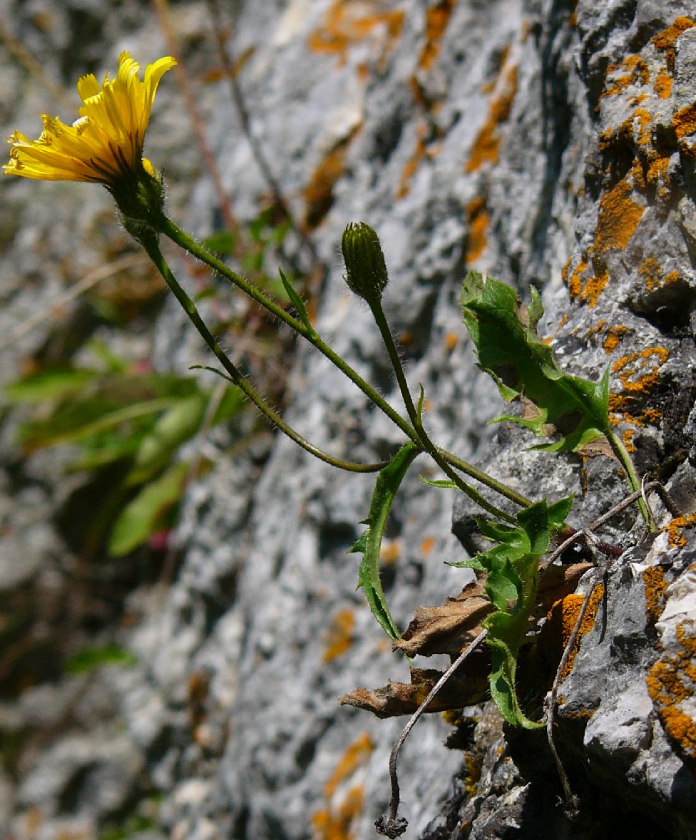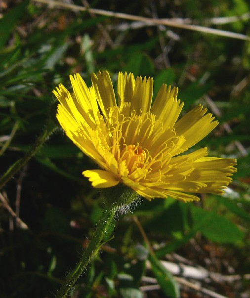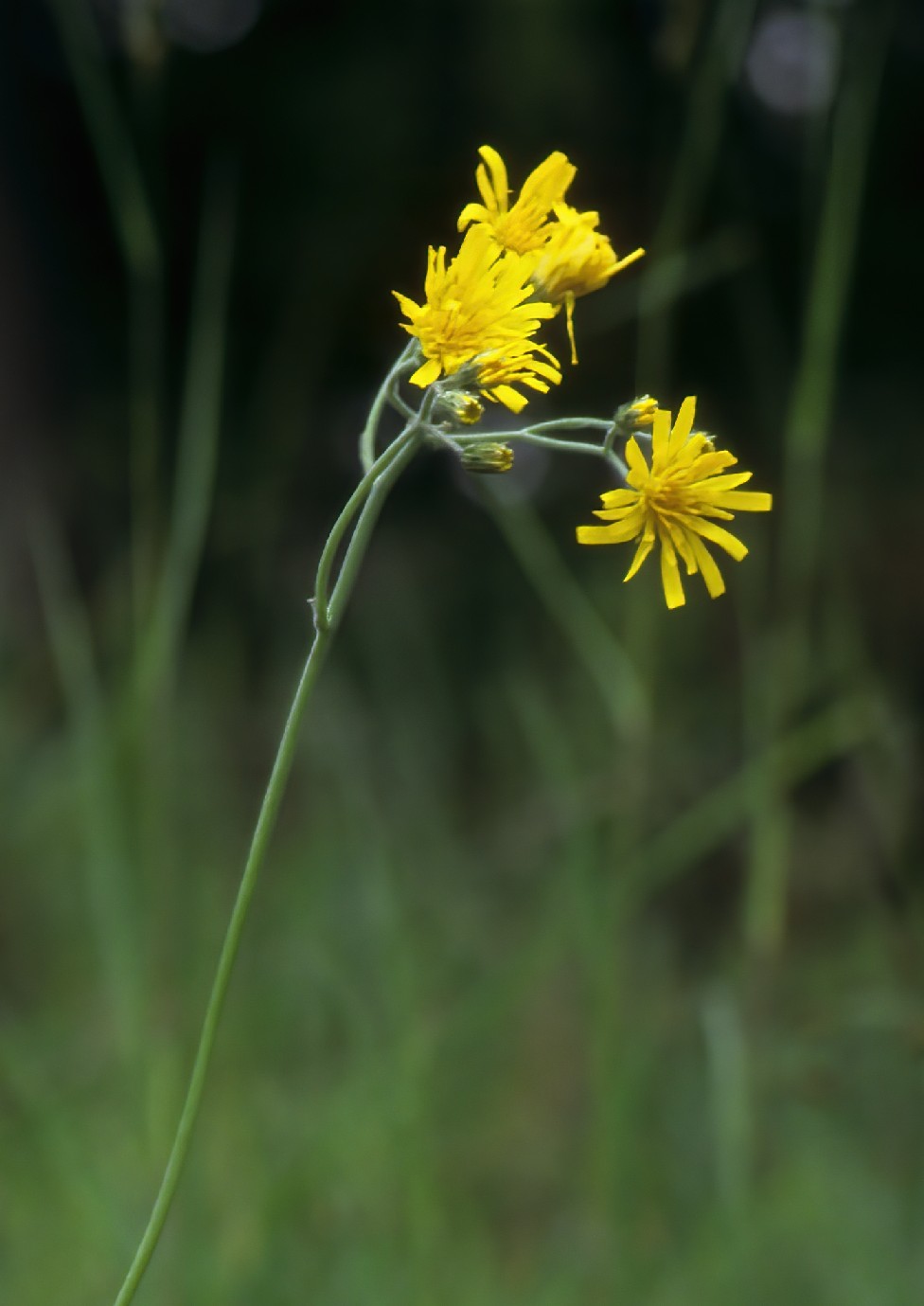 Habichtskraut- Blüten gelb, Hülle mit weißen Borsten, Stängel oft mehrköpfig, mit 1 - 8 Stängelblättern