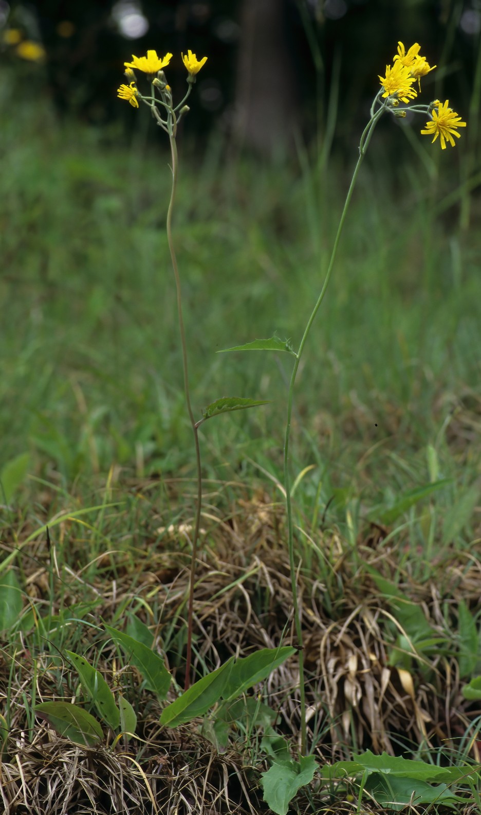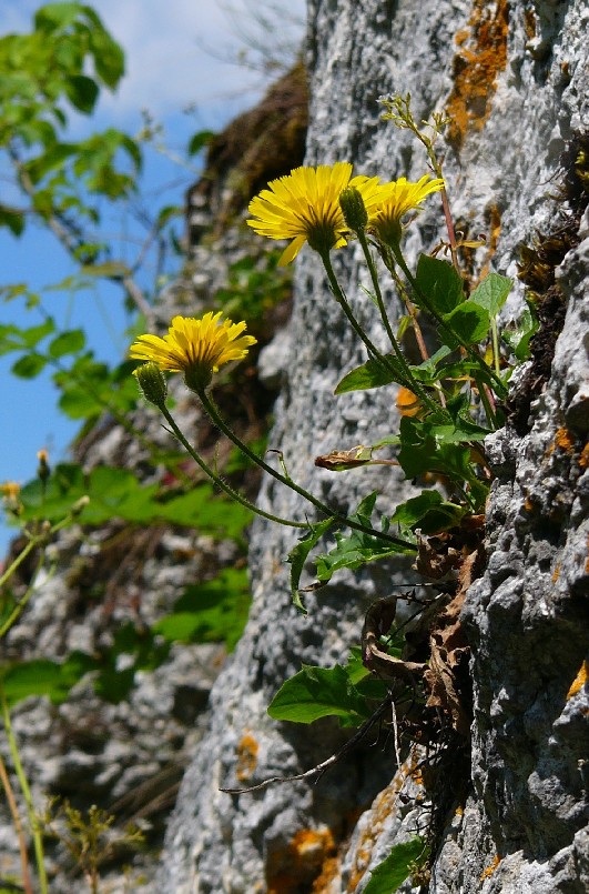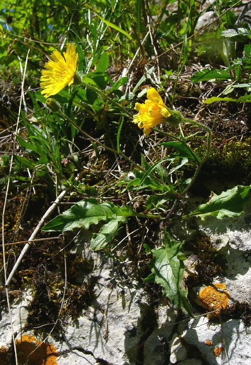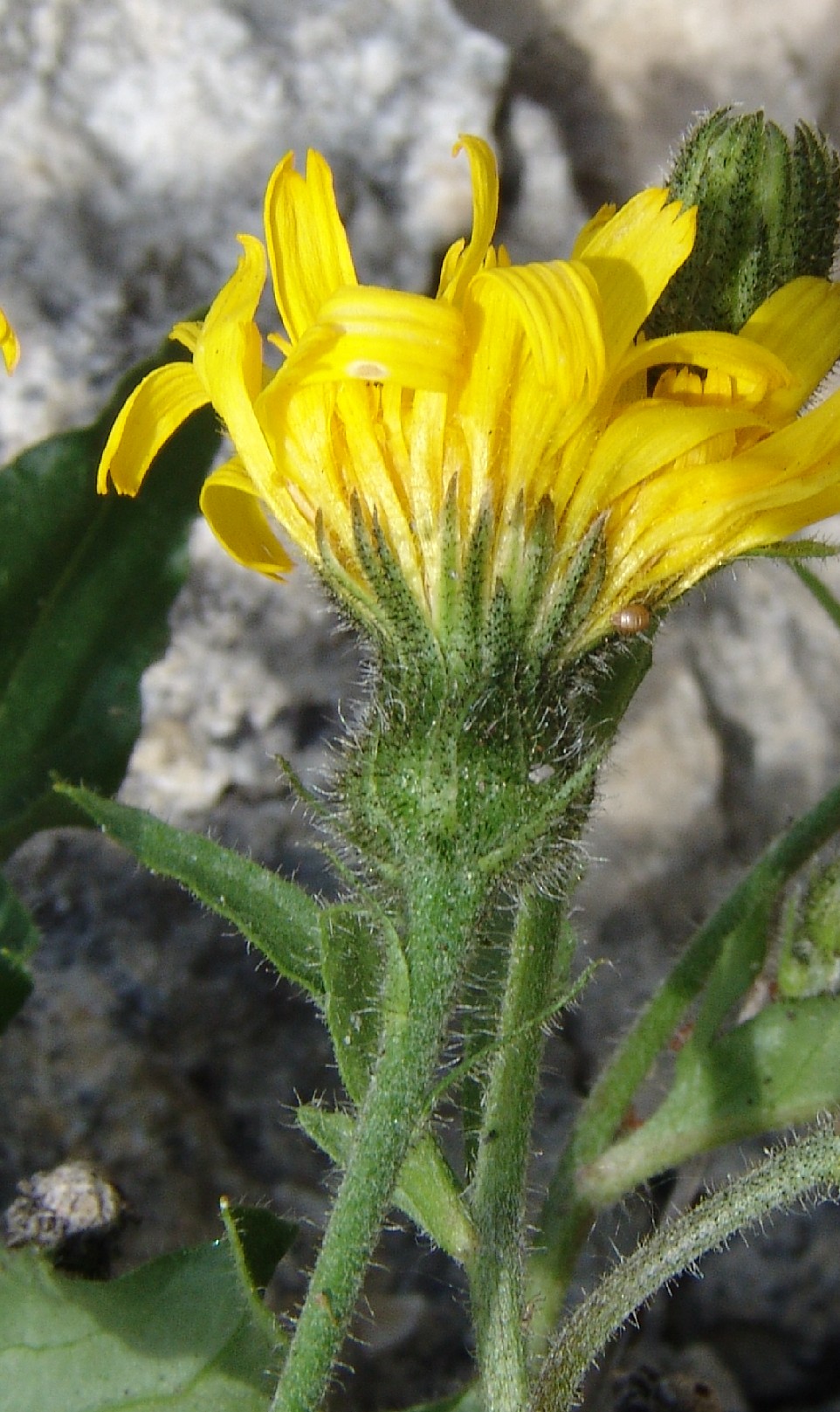 Habichtskraut- Blüten gelb, Hülle mit weißen Borsten, Stängel oft mehrköpfig, mit 1 - 8 Stängelblättern
