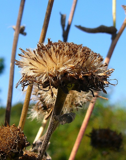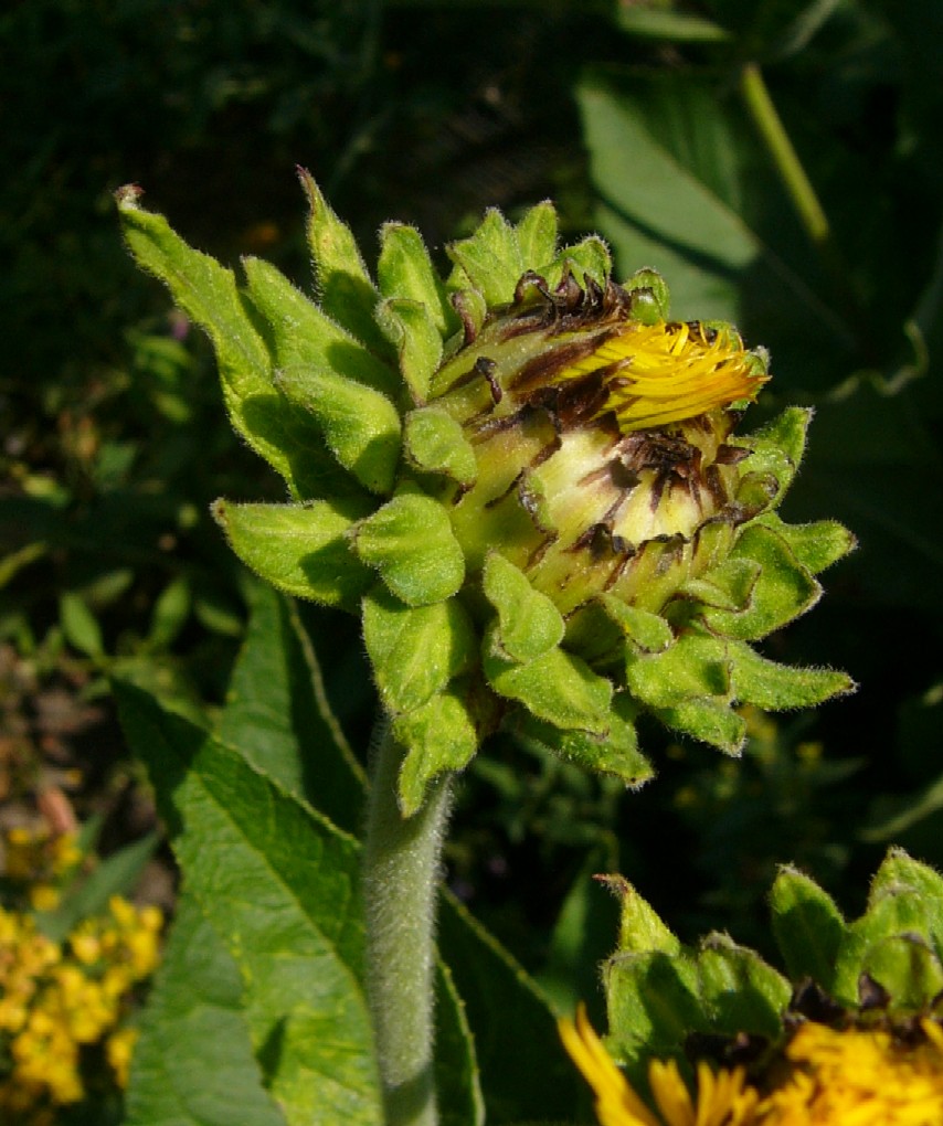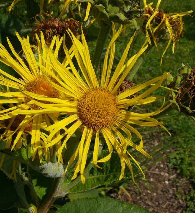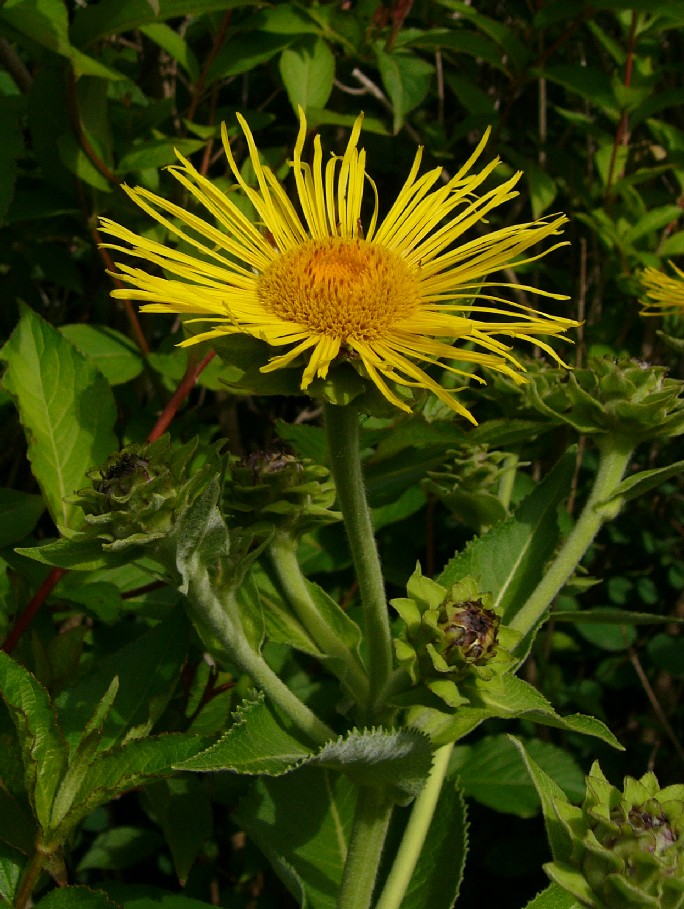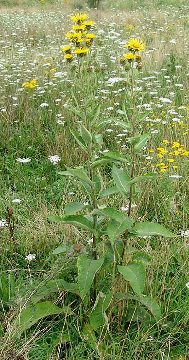 Inula: Pflanze 100 - 250 cm groß, Zungenblüten deutlich länger als die Hülle, Blätter grün