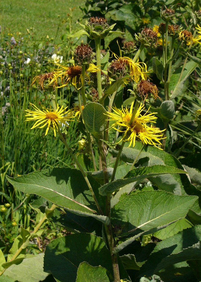 Ruderalstellen (500 - 1200 m Synonyme: English name: Nom francais: Nome italiano: Weltweite Verbreitung: Eingebürgert in: Die Pflanze wurde früher als Heil- und Gewürzpflanze verwendet. Sie enthält viel Inulin, ein dem Fruchtzucker ähnliches Kohlenhydrat. Ähnlich und ebenfalls häufig in Gärten gepflanzt ist Telekia speciosa, die allerdings scharf gesägte, breit eiförmige Blätter besitzt. Häufig als Zierpflanze in Gärten.