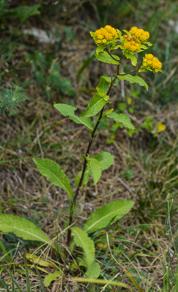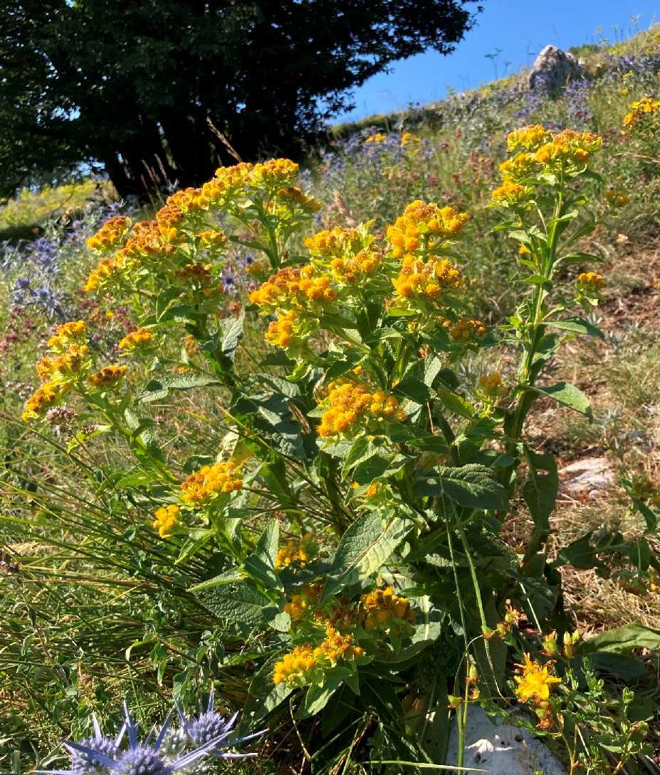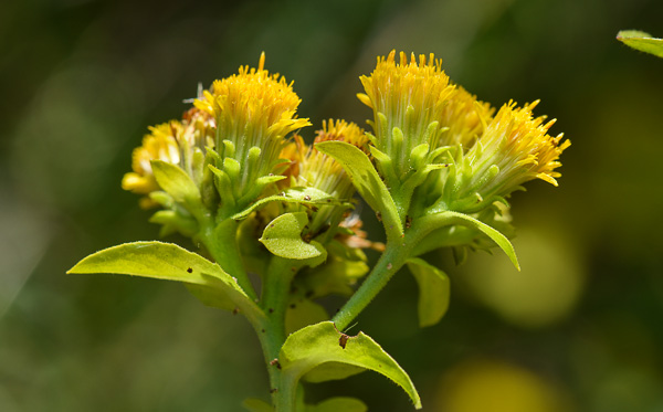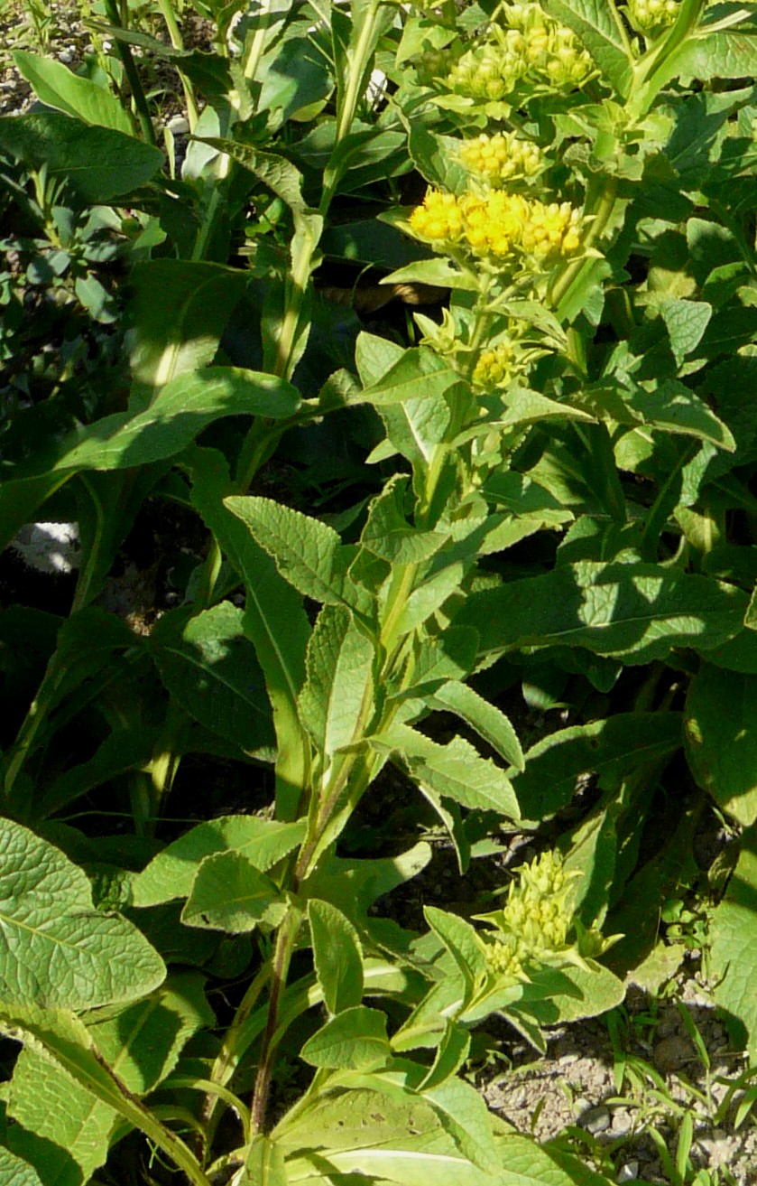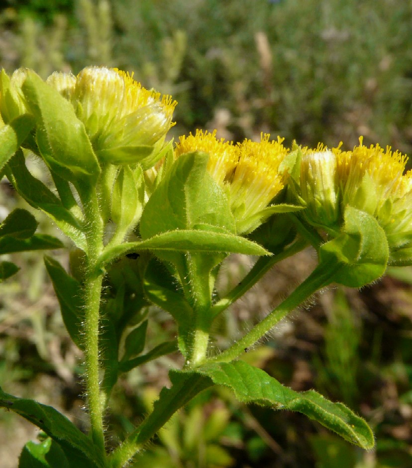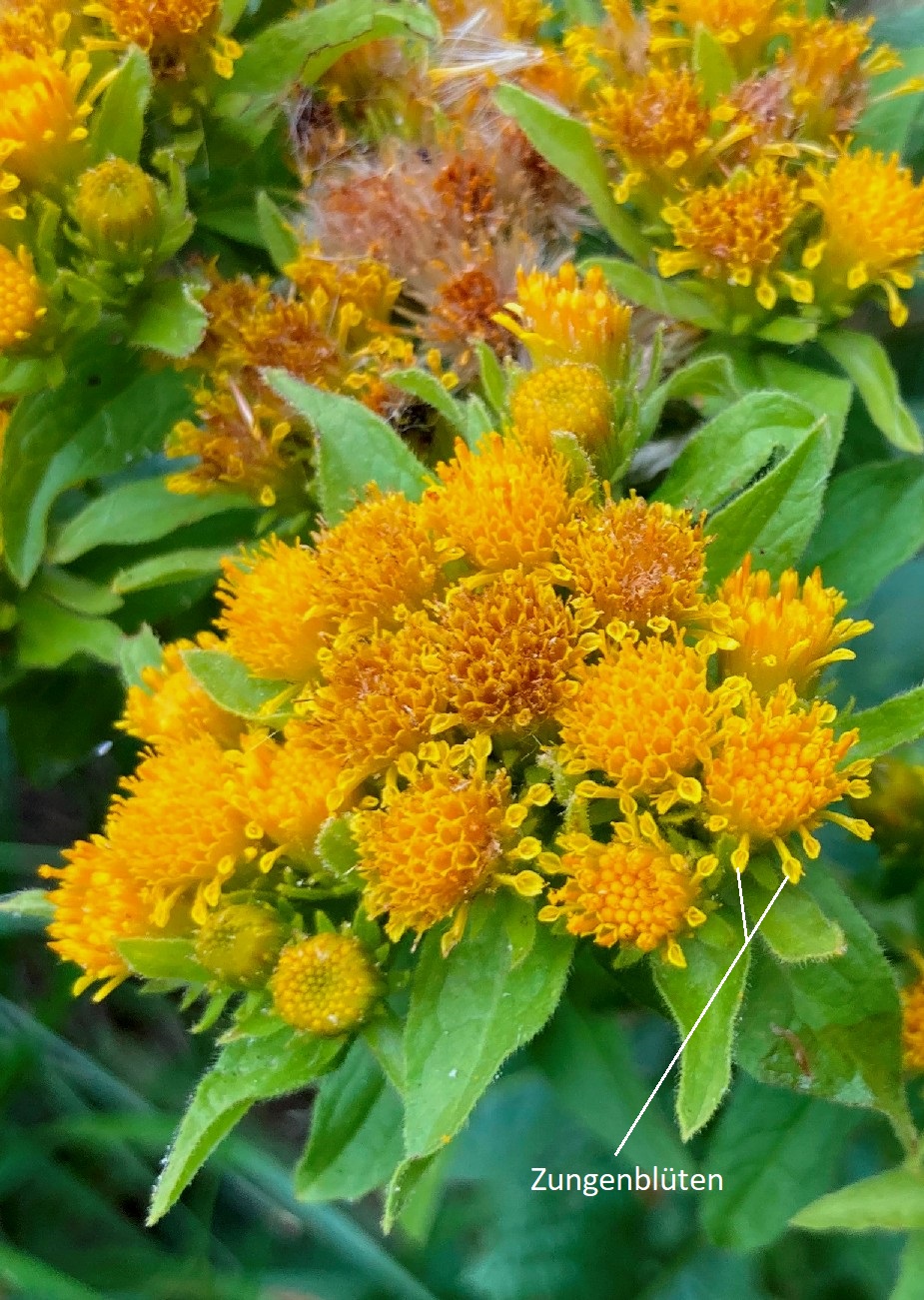 Inula - Pflanze nicht schneeweiß filzig behaart, Köpfe nur mit Röhrenblüten oder Zungenblüten nicht sichtbar, Blätter grün