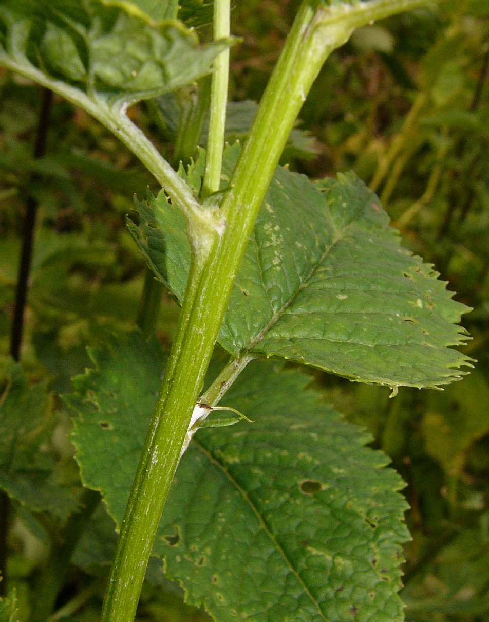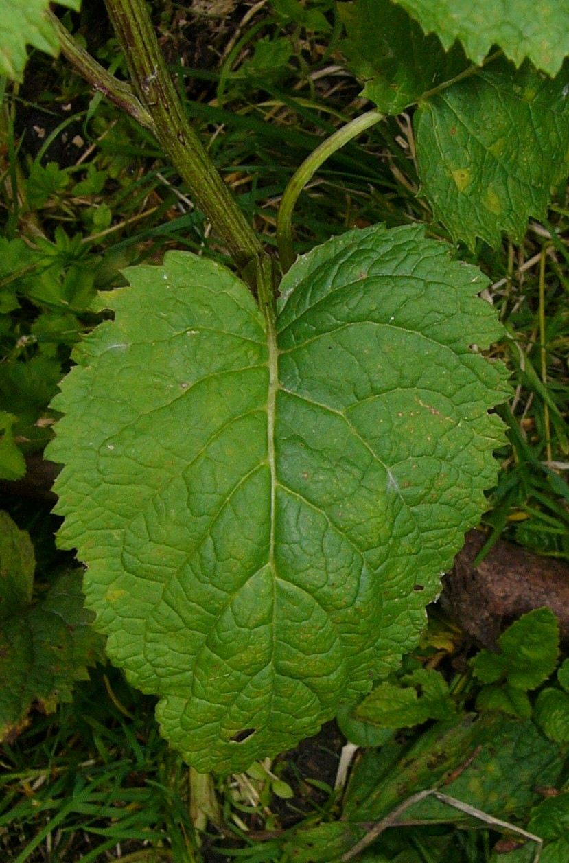 Früchte 3,5 mm lang, kahl Blätter 3 - 6 cm lang, 3 - 6 cm breit, am Grund herzförmig stängelumfassend, oberseits grasgrün, Rand grob doppelt gesägt, die unteren oft auch leierförmig, mit schmalen seitlichen Fiederabschnitten Blattstiele der unteren Stängelblätter und der Grundblätter geflügelt