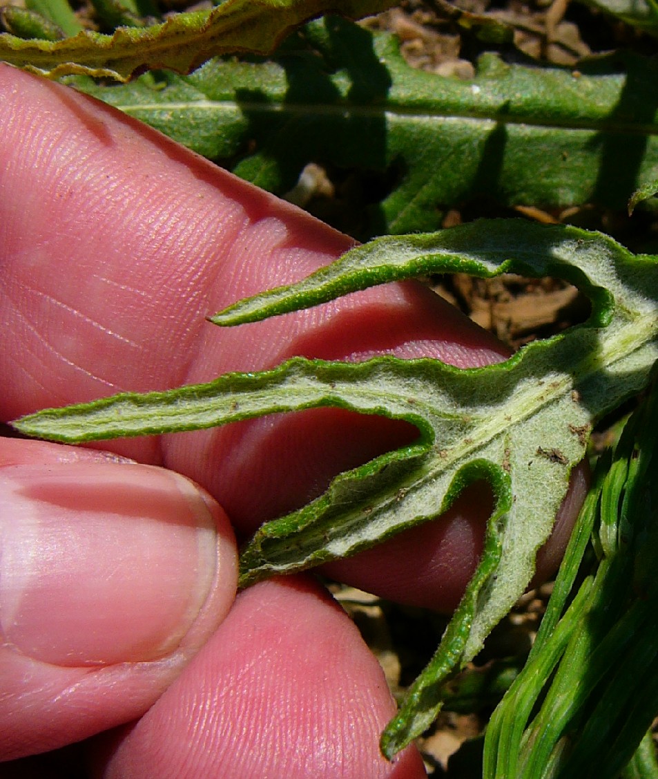 Frucht 4 – 5 mm lang, warzig, undeutlich längsrippig, mit unauffälligem Krönchen, Pappushaare wenig länger als die Frucht Laubblätter fiederteilig, oberseits spinnwebig, unterseits weißfilzig,