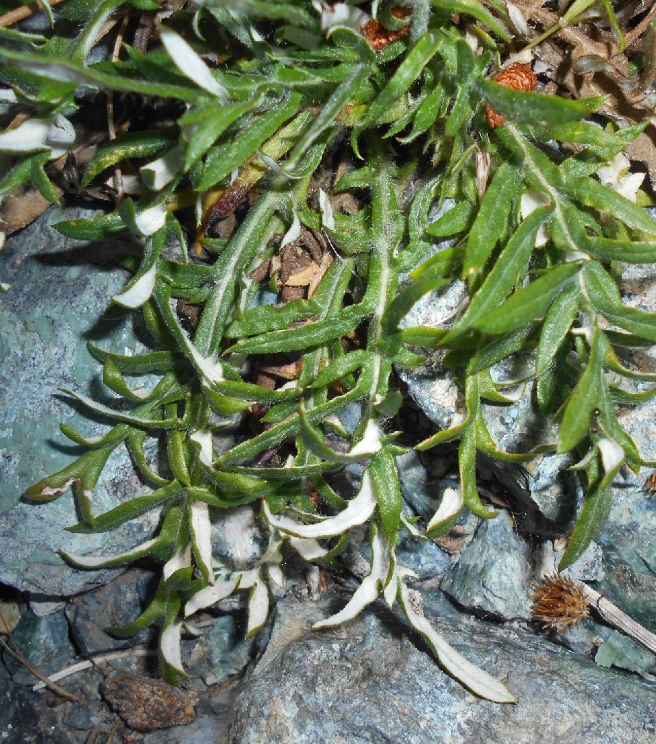 Grundblätter 4 - 10 cm lang, fiederteilig,mit 7 - 12 lanzettlichen, stachelspitzigen Fiederabschnitten, am Rand umgerollt, oberseits grün, spärlich spinnwebig, verkahlend, unterseits schneeweiß- filzig