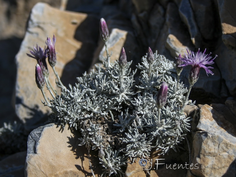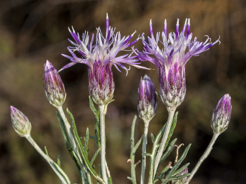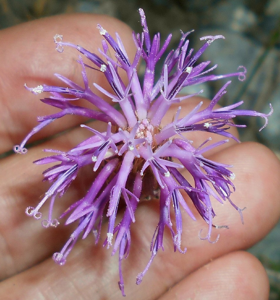 Köpfchen nur mit Röhrenblüten, Röhrenblüten purpurviolett, Randblüten nicht vergrößert, Hüllblätter 4 - 5-reihig, dachziegelig, schmal- linear, spitz, ohne Anhängsel,, die inneren violett