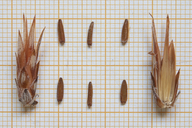 Früchte 3 - 4 mm lang, gerippt, fein warzig, kahl mit mehrreihigem, rauen, nicht gefiederten Pappushaaren, die 3 - 4 mal so lang wie die Früchte sind