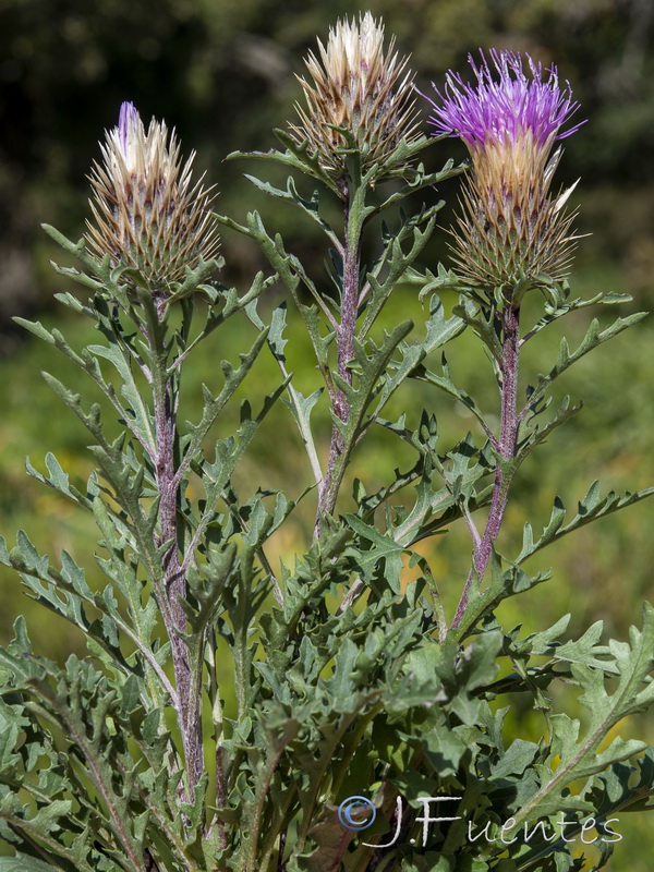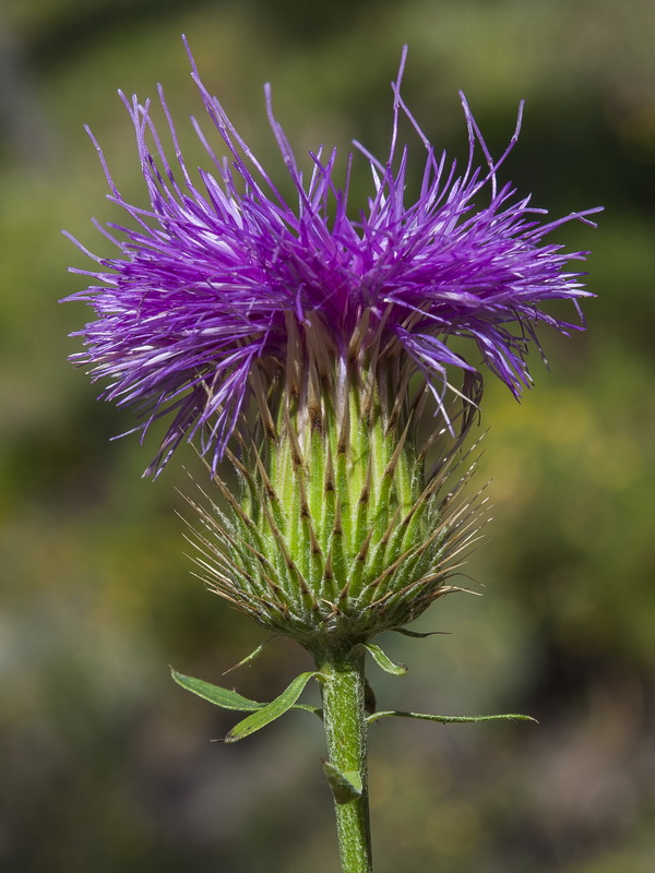 Hülle eiförmig, 5 - 7-reihig, 15 - 40 mm lang, 10 - 20 mm breit, Hüllblätter dachziegelig, grün, mit 3 deutlichen Adern, kahl oder spinnwebig behaart, allmählich in einen 2 - 14 mm langen, aufrechten, nicht umgebogenen, stechenden Enddorn verschmälert