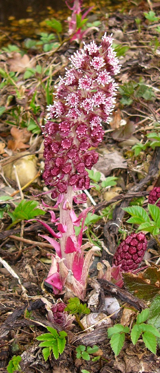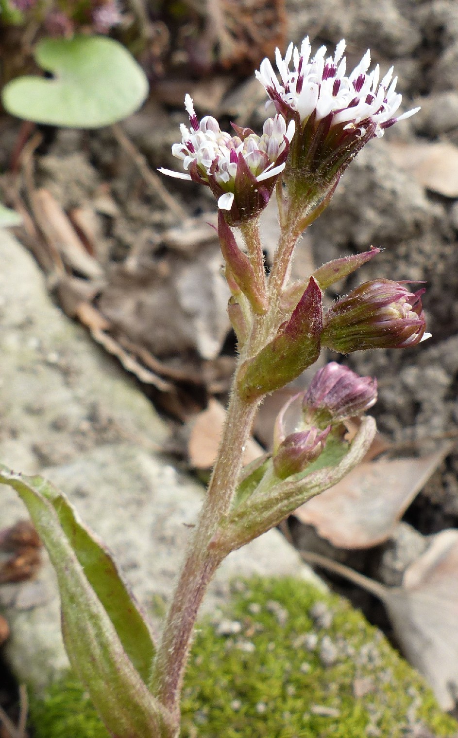Köpfchen Hüllblätter grün, violett überlaufen, Stängelblätter aufgeblasen > Petasites doerfleri/pyrenaicus