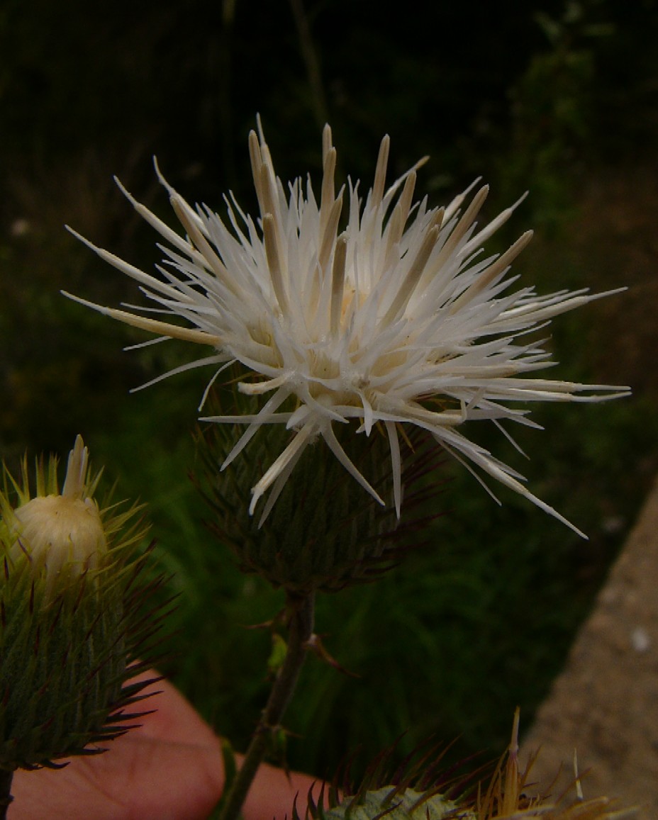 Griechenland, ohne Ionische Inseln Obere Stängelblätter kurz, am Grund mit lang bedornten Lappen Blüten oft weiß, Hüllblätter pfriemlich, mit langem Dorn > 1 |