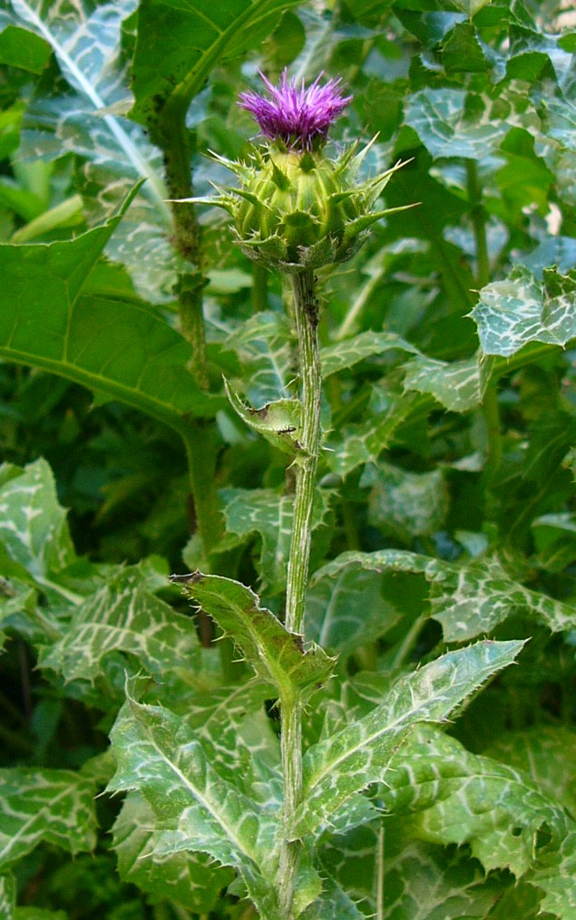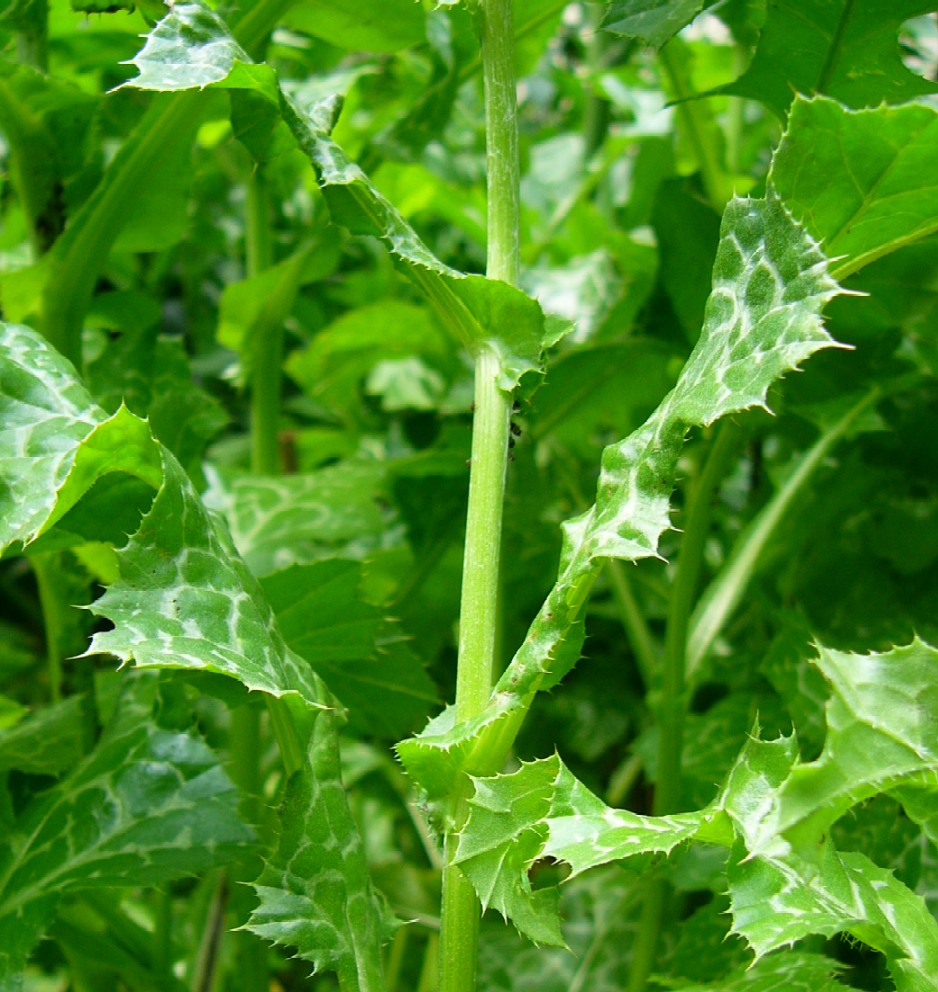Blätter weiß gefleckt, glänzend, kahl, am Rand mit bis zu 8 mm langen Dornen