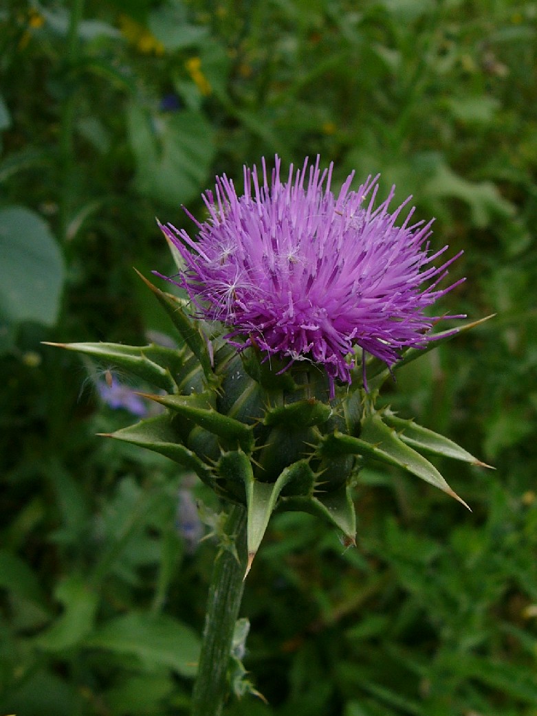 Hüllblätter am Grund breit, stachelig, plötzlich in einen langen Dorn auslaufend