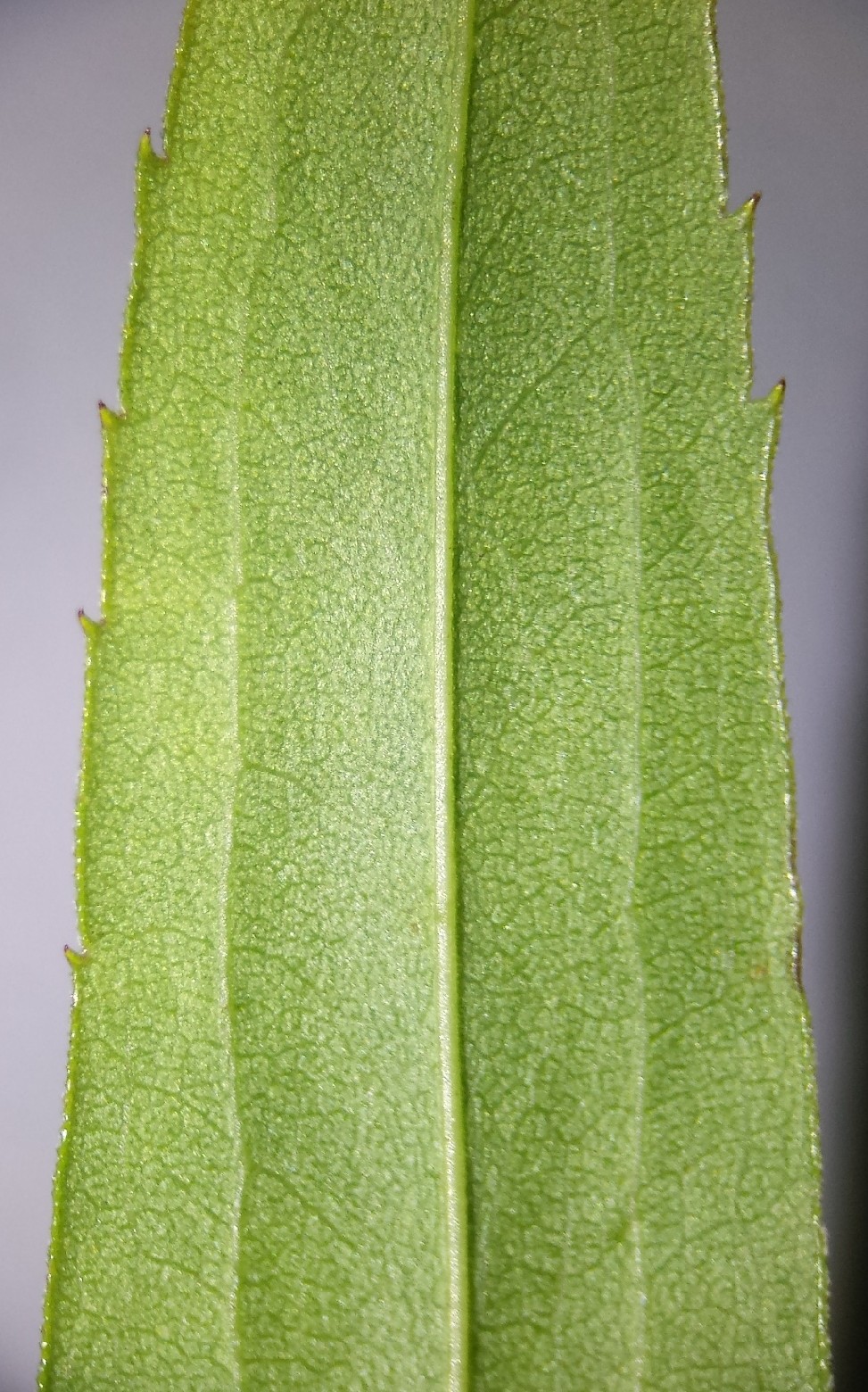 Blätter breit- lanzettlich, ganzrandig oder gesägt, oberseits kahl und glatt